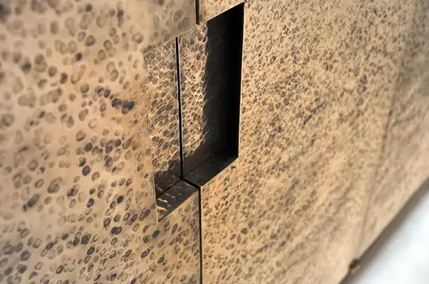 Hand hammered bronze is a laborious process where the metalworker strikes bronze sheet thousands of times with a polished hammer. Hours of flattening and polishing bring the rough surface up to a gleaming liquid shimmer of light. Used over the years in many decorative applications, few are doing it even on this large of a scale and to this level of polish and precision.