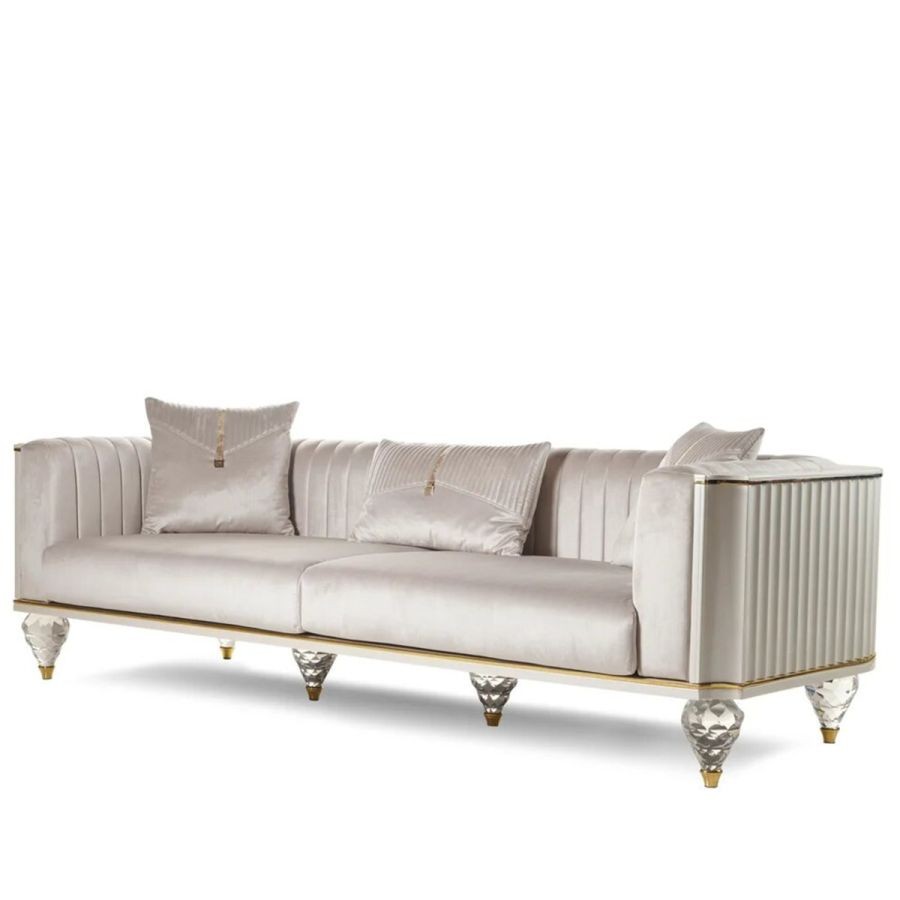 The fabulous Aella Sofa with a soft velvet upholstery and crystal legs with gold accents oozes a touch of decadence.