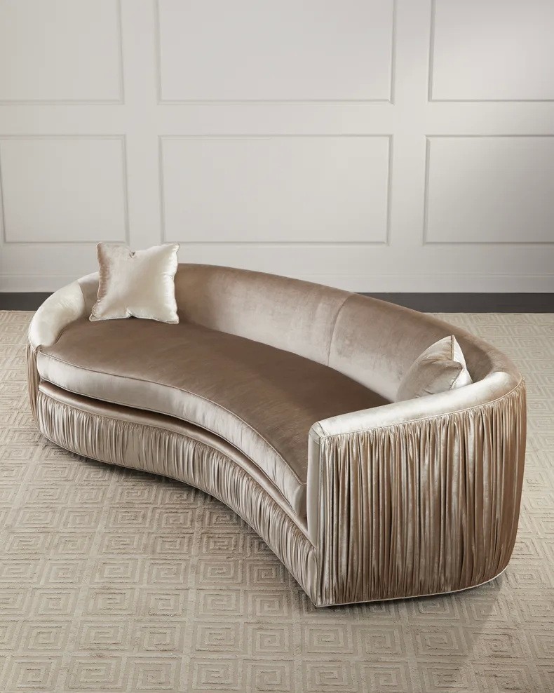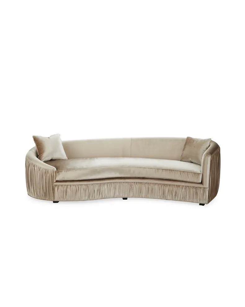 Handcrafted sofa features ruched outside back and asymmetrical silhouette