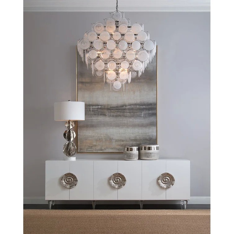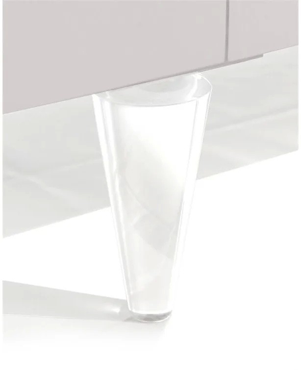 Standing on turned acrylic legs and finished in ice white, this six-door credenza has bold, silvered escargot handles on each pair of doors. Soft-closing hinges are fitted, and adjustable shelves finish out the interior.
