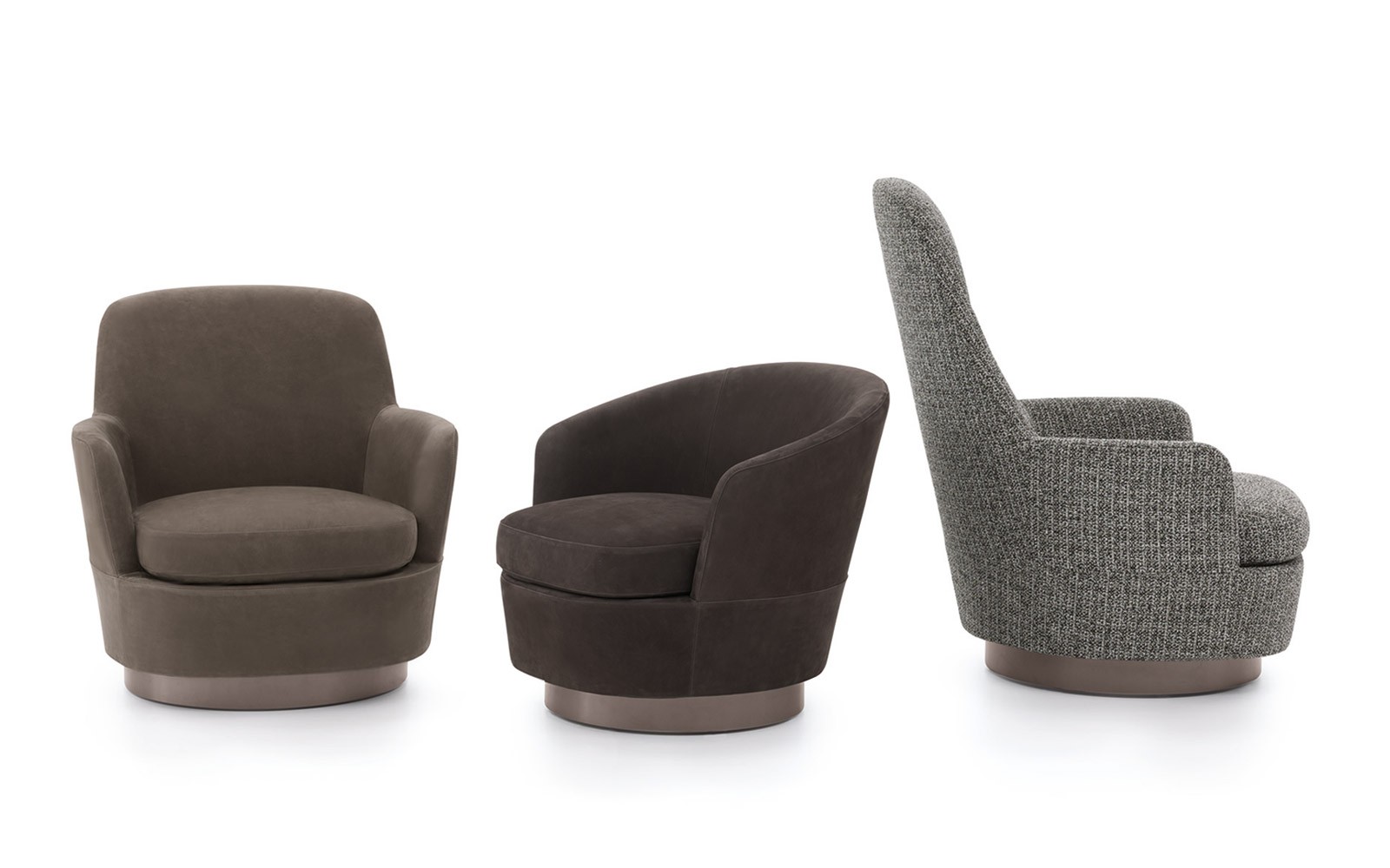 Sofa bases are semi-curved metal blades; armchairs and ottomans have full perimeter curved bases; both with a polish anti-fingerprint Bronze varnished colour and come with adjustable feet. The base of the armchairs is available with 360° swivel movement (without return) or fixed. Black protective polyethylene glides.