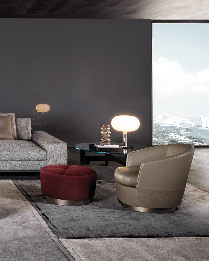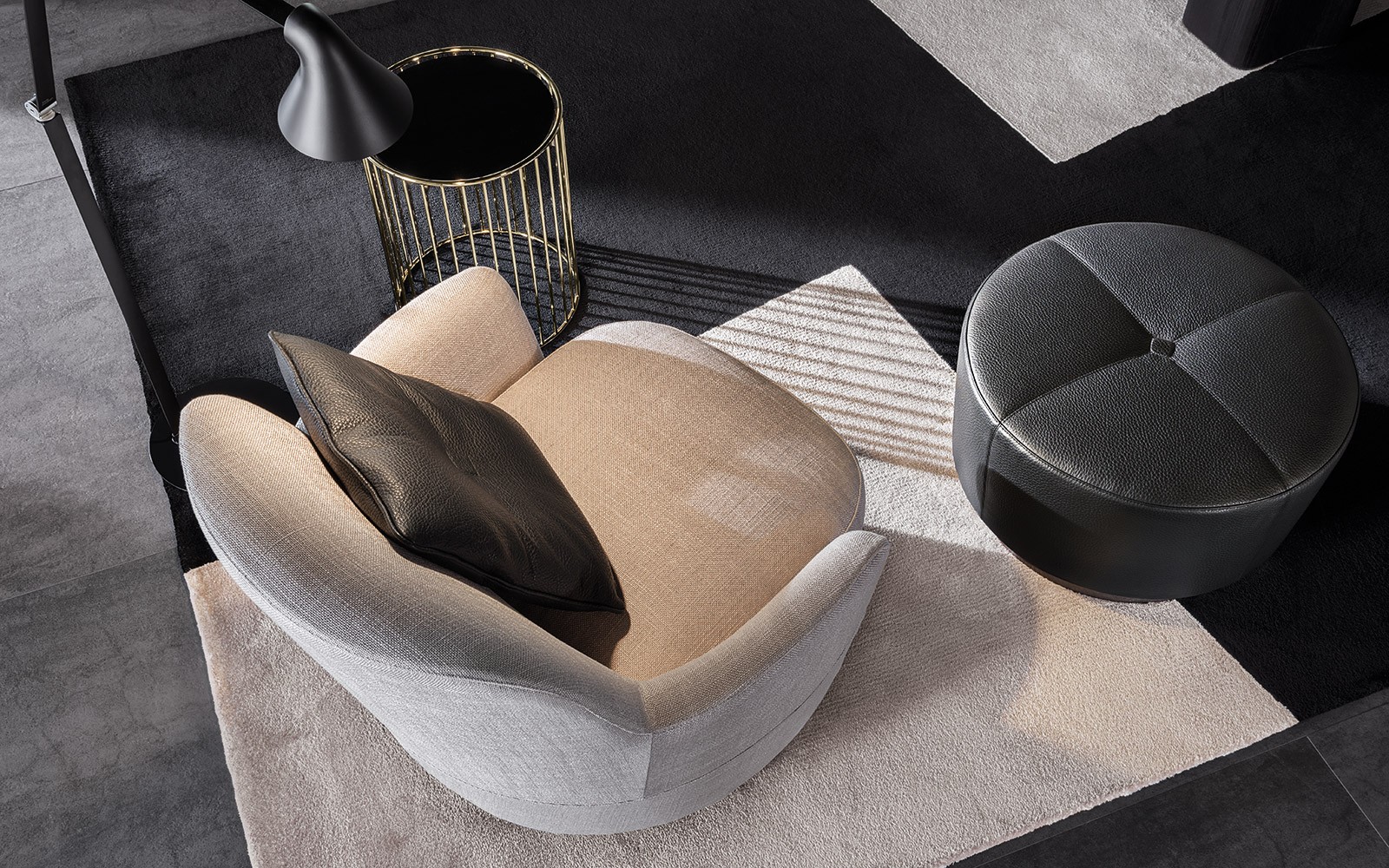 Thanks to its soft seat cushion and backrest padding, the Jacques bergère, available both with fixed and swivel base, with swivel base is extremely comfortable and lends itself to the creation of spaces where relaxation is key. When combined with its ottoman and the Song coffee table that embraces the armchair with its organic shape, it becomes a functional table-top surface for a lamp or to display various kinds of objects.