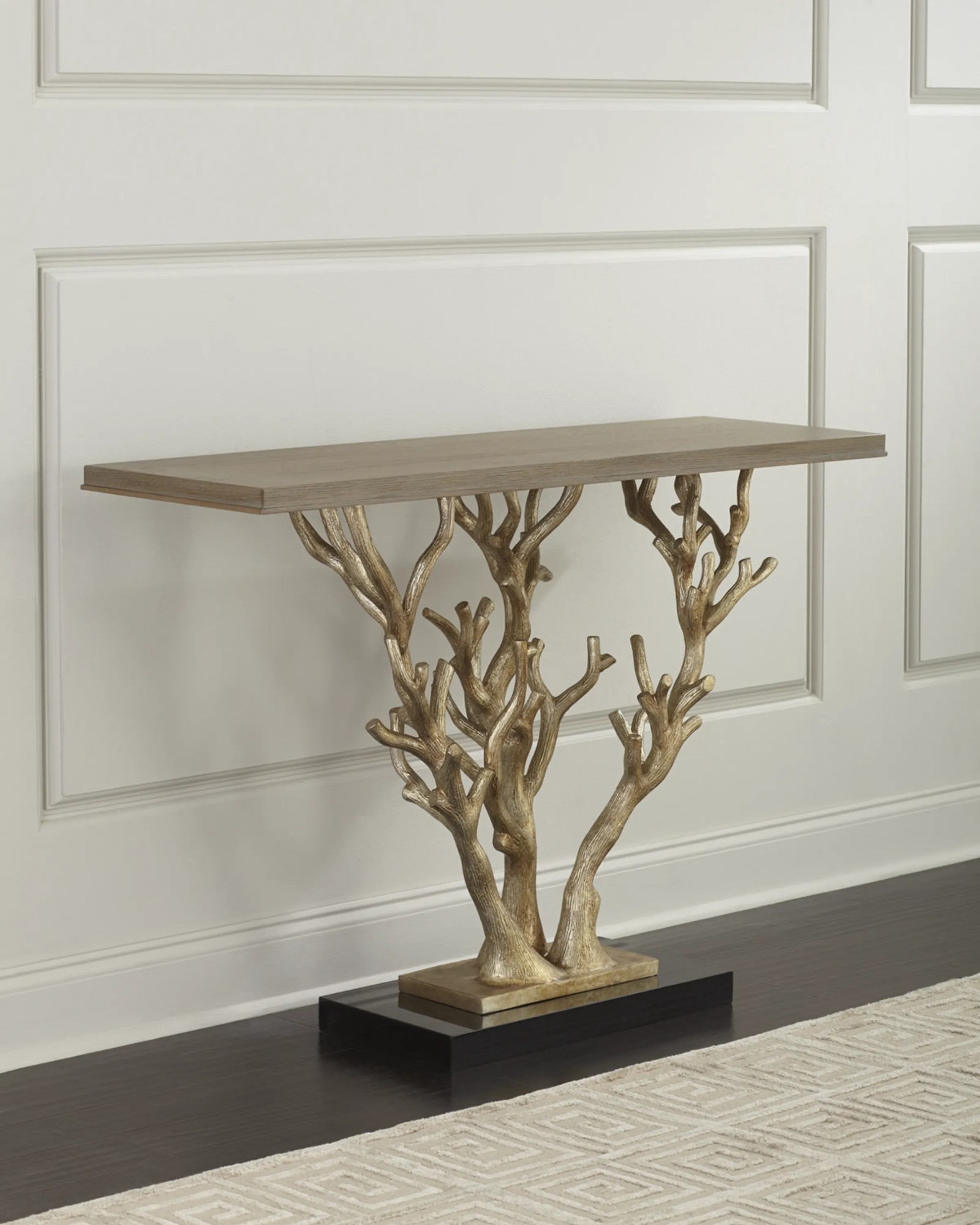 Ships from vendor.This tree branch inspired console features a small cast aluminum base finished with antiqued silver metal leaf and set on top of a larger black granite base. Top is American white oak in a ceruse finish.