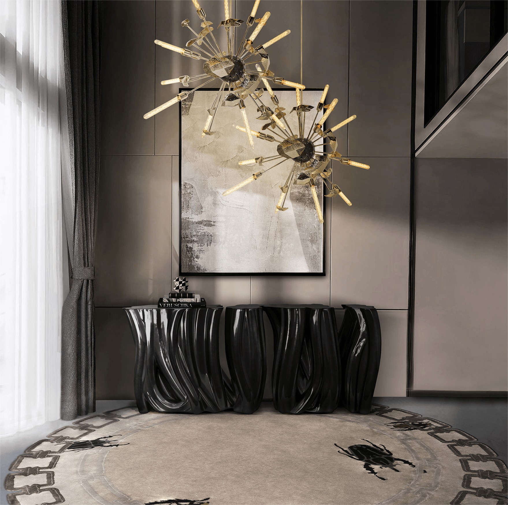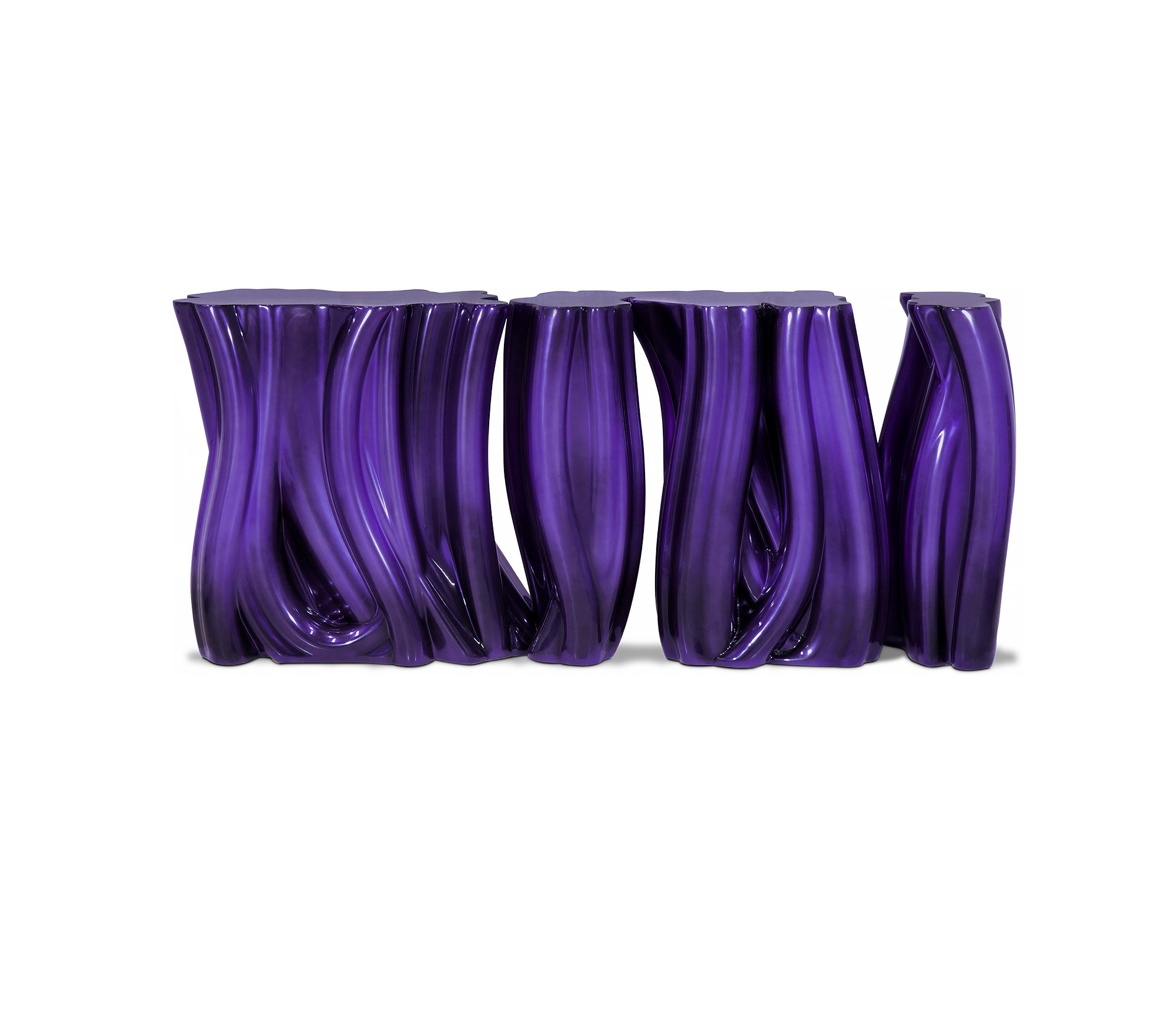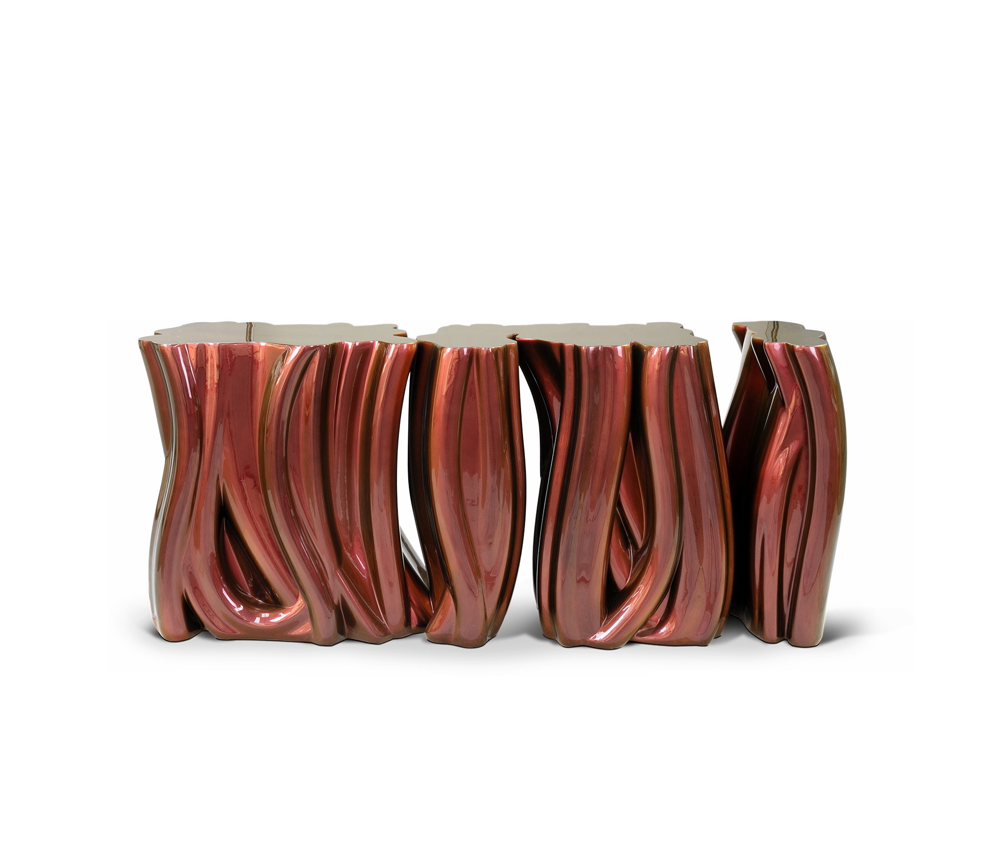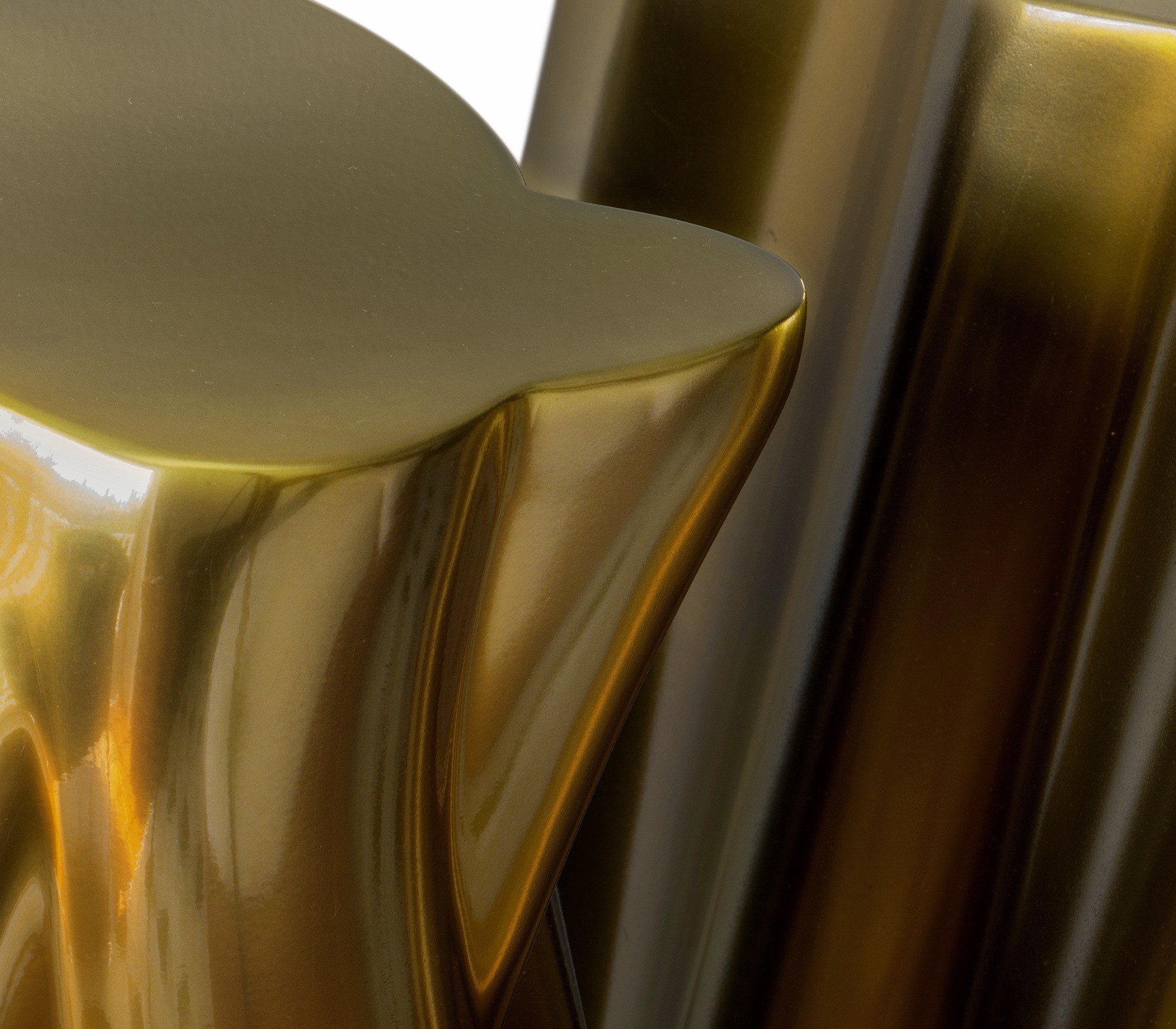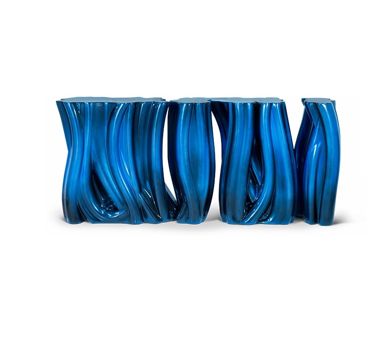 Carefully built from resin, the Monochrome is composed by three separate modules, covered by an exquisite gold finish with a black gradient hint as result of advanced experimentations, and finished with a high gloss varnish coat. An avant-garde console that conveys a seductive and fearless attitude due to its unique and challenging design.