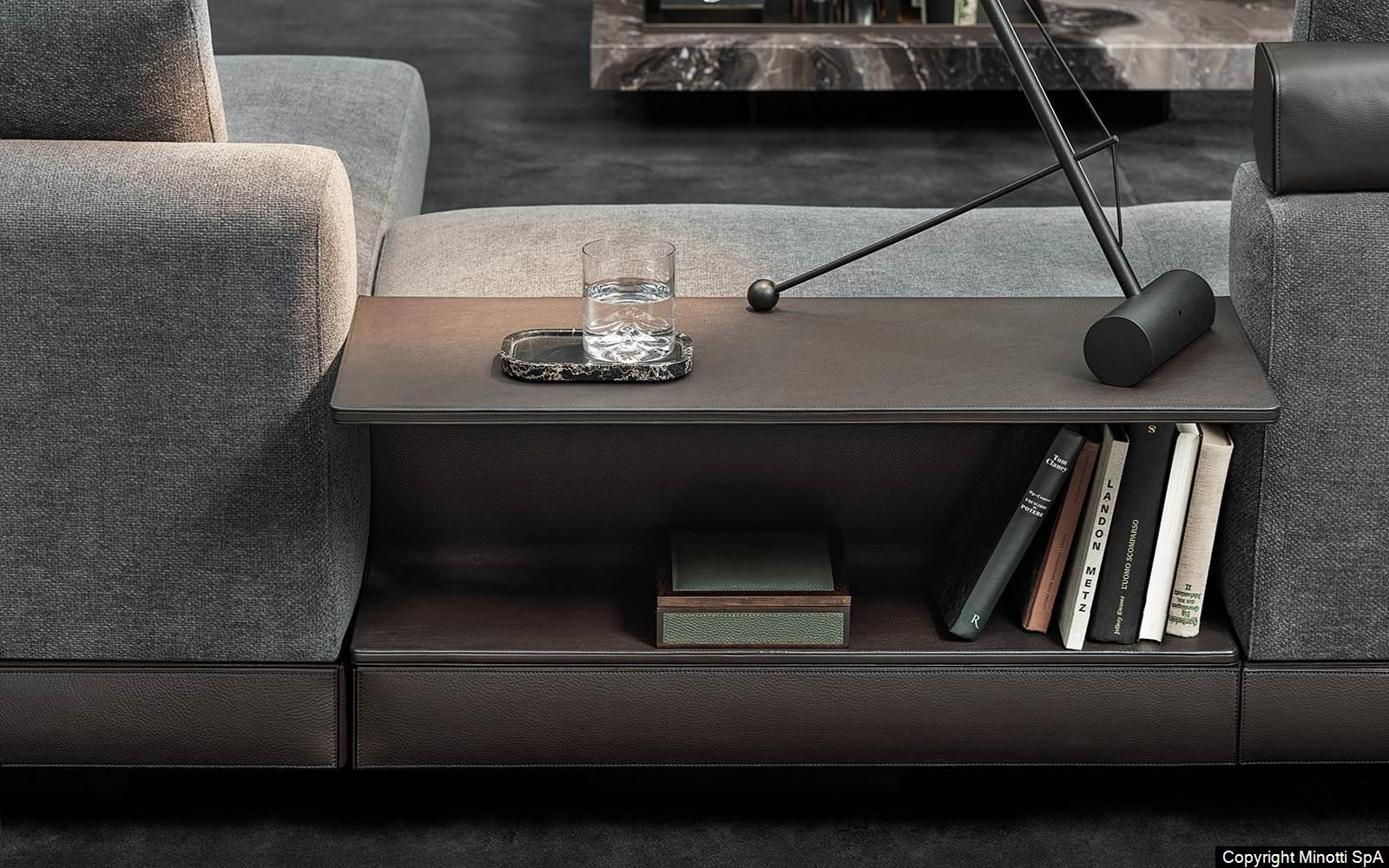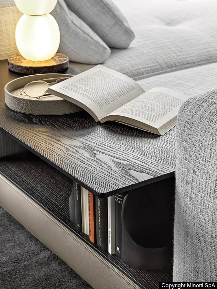 As well as the fabric covering, the padded structural base can also feature a covering with strips of leather, crafted with the same technique used in fine leather luggage-crafting. References to the concept of high-end leather goods are also found in the headrests and the elegant “C”-shaped Flap surfaces, which seamlessly blend into the seating elements, animating the compositions with a vibrant rhythm.