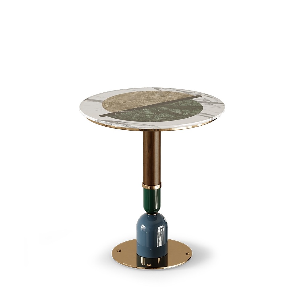 Materials and Finishes: Matte Walnut Wood, Glossy Lacquered Wood, Carrara Marble and Gold Plated Brass