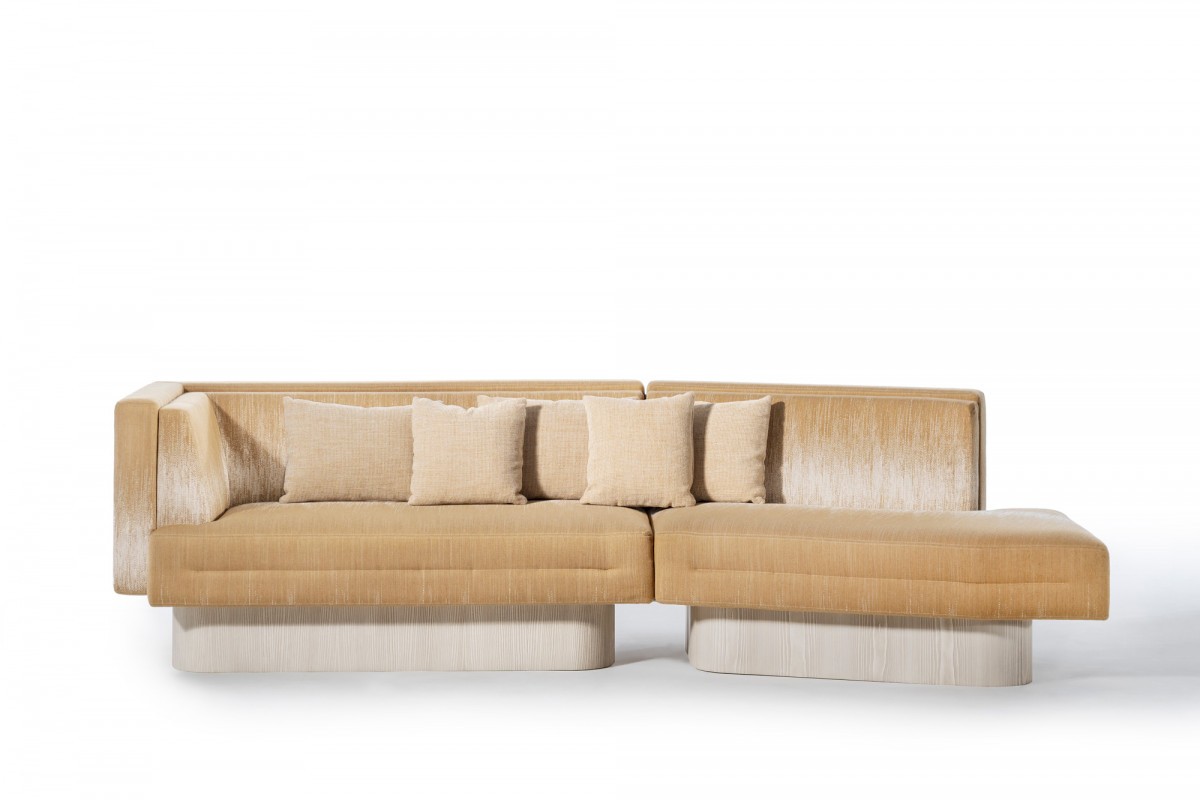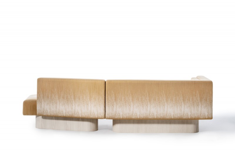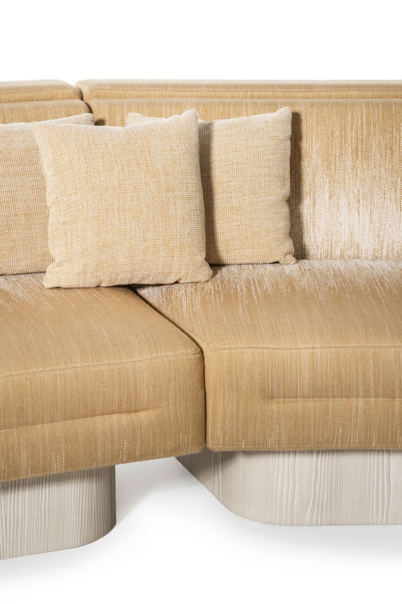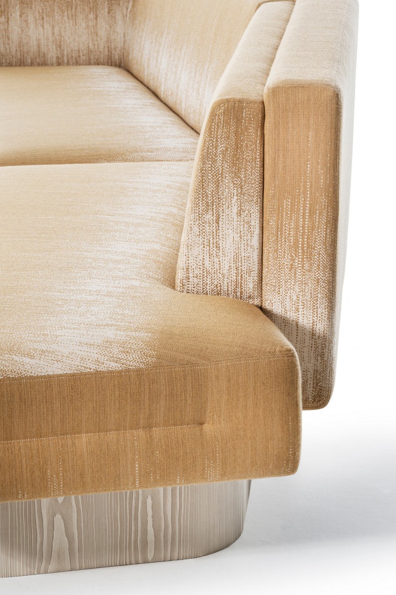 A very structured shape, but which in no way contradicts the softness of the seat and backrest; a majestic double base in sanded pine, which accentuates the lightness; a play on asymmetry, with a single armrest, and a "platform" suspended at the other end. All these features make the Nashville canapé a piece as spectacular as it is daring. Its upholstery, a subtly streaked jacquard (like its base), combining several shades of pale gold, as if aged, patinated by time and the sun, accentuates its very glamorous side.