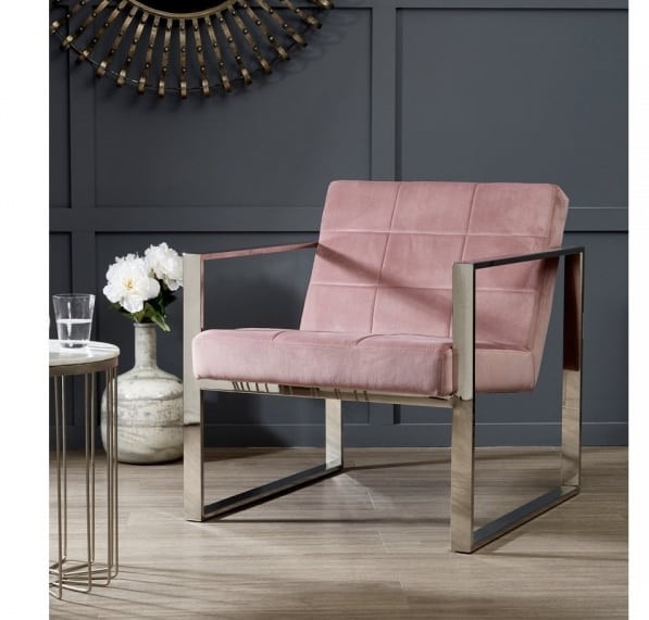 The chair is designed to add a touch of vintage glamour to the living room. The chair's frame is made from polished stainless steel and has a simple square design that provides a platform for the pastel pink/black/blue seat. The wide seat is upholstered with luxurious velvet and has a tufted grid finish. The frame is angled at the base allows the seat to attain a slightly reclined position.