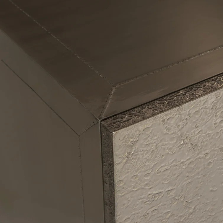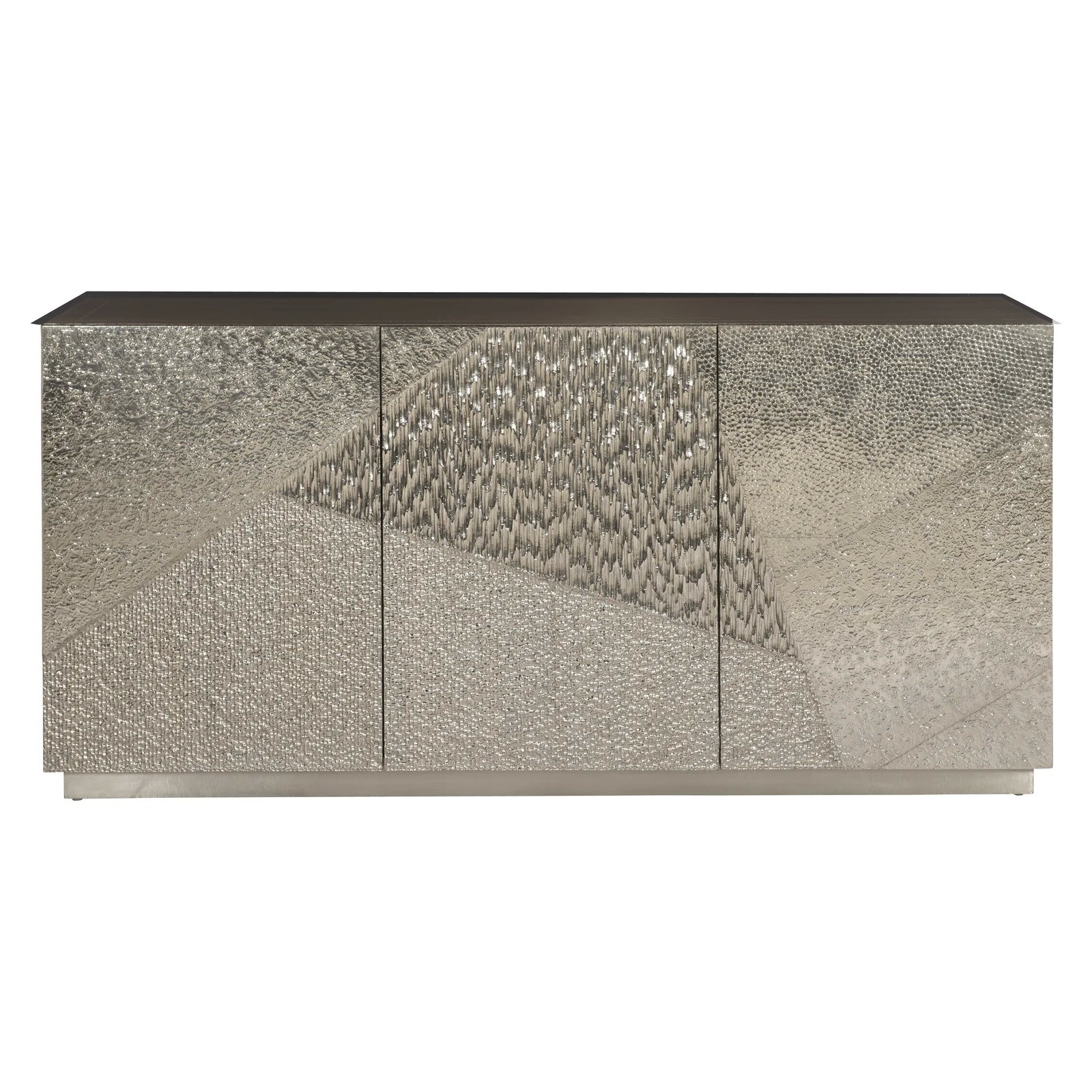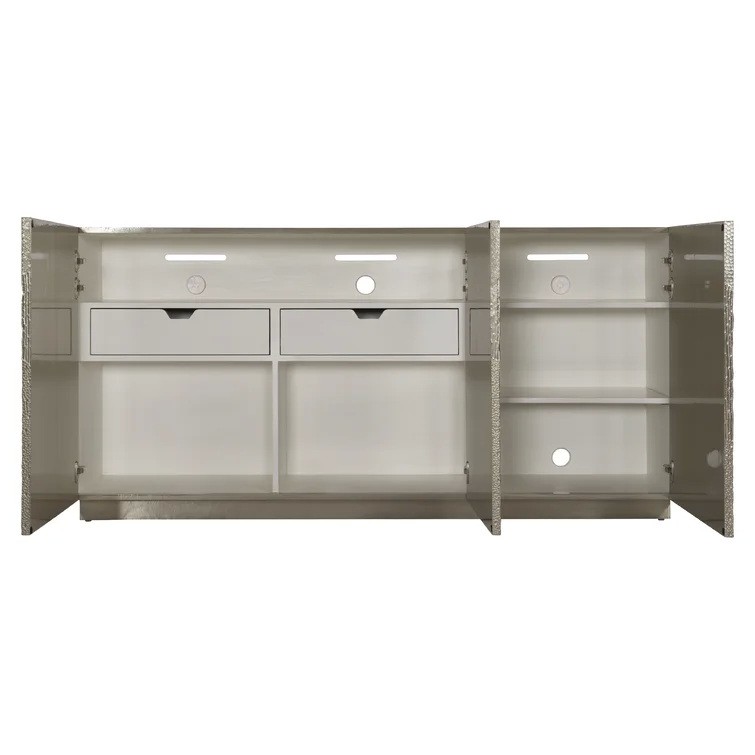 The Gatlin buffet offers style, storage, and textural sophistication in one design. Featuring four distinct patterns, the three doors are clad in gleaming German silver. Open them to reveal an interior that includes two soft-close drawers, compartments, and shelves, one of which is adjustable, to accommodate a wide variety of storage needs.