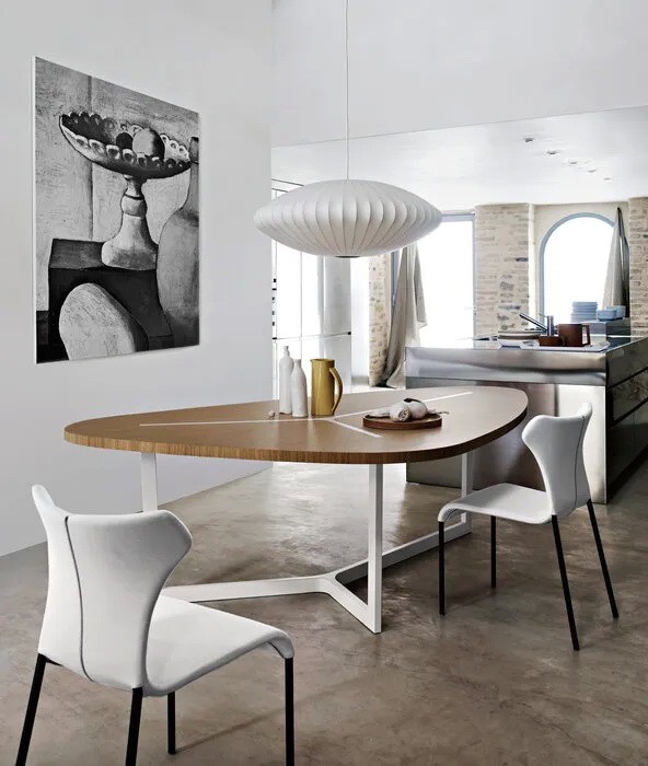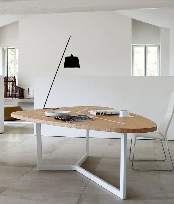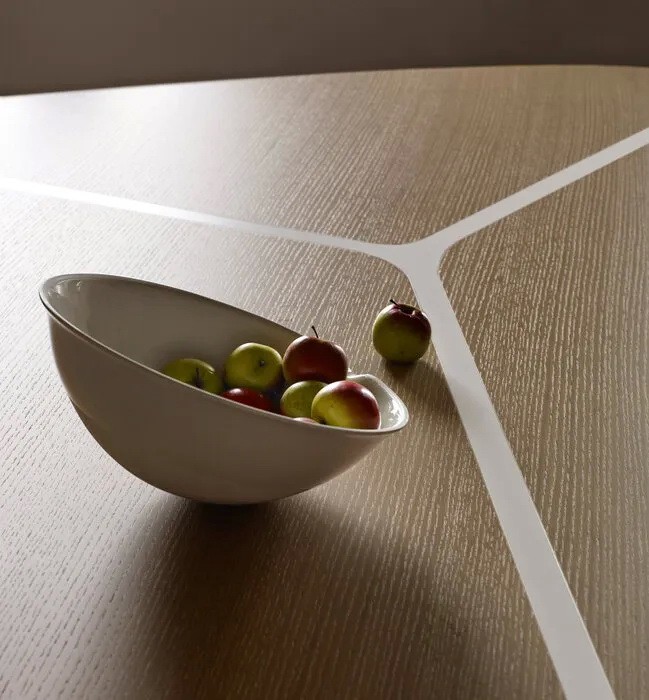 Three uneven sides are an alternative to the traditional layout. Designed to seat 7, in the formation 3+2+2. The appearance changes depending on the wood or lacquer finish but the pattern of the three-branch structure emerges on the top’s surface creating a graphic decoration to contrast with or match the colour of the top.
