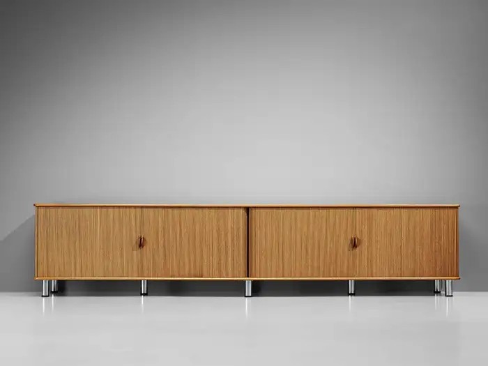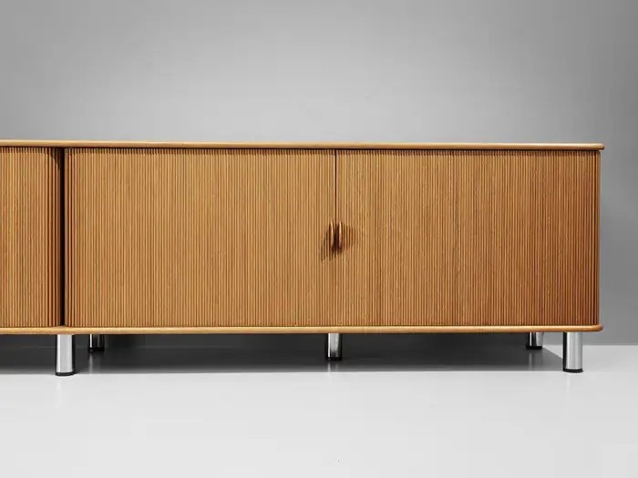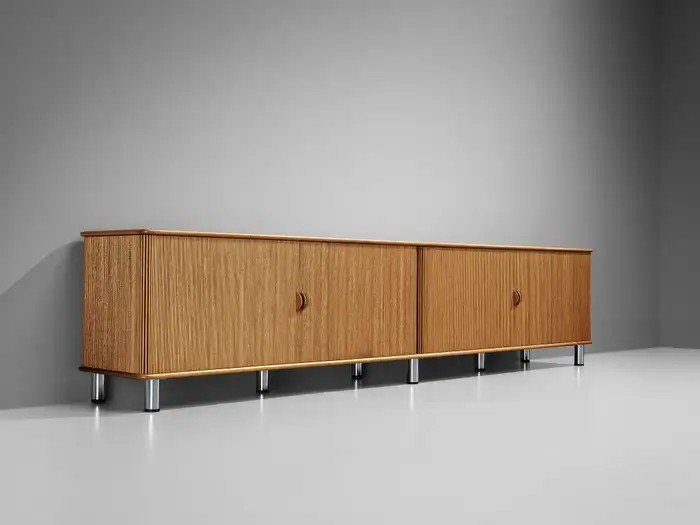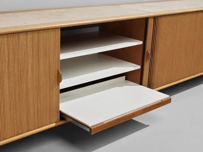 The sideboard features sliding-tambour doors which hold a lovely vertical, rhythmic pattern. In addition, the top is inlayed with a creme-colored fossil marble. What makes this so special and one of a kind, is the presence of real preserved imprints of nature. The present spiral fossil, called Ammonite, originates from squid species that went extinct about 65 million years ago. Upon accessing the interior of the cabinet, one discovers a sophisticated storage arrangement consisting of drawers, shelves, and record holders. In all, this rare cabinet exemplifies the duo's exceptional talent and remarkable ability to create furniture that combines functionality with an aesthetically pleasing layout.