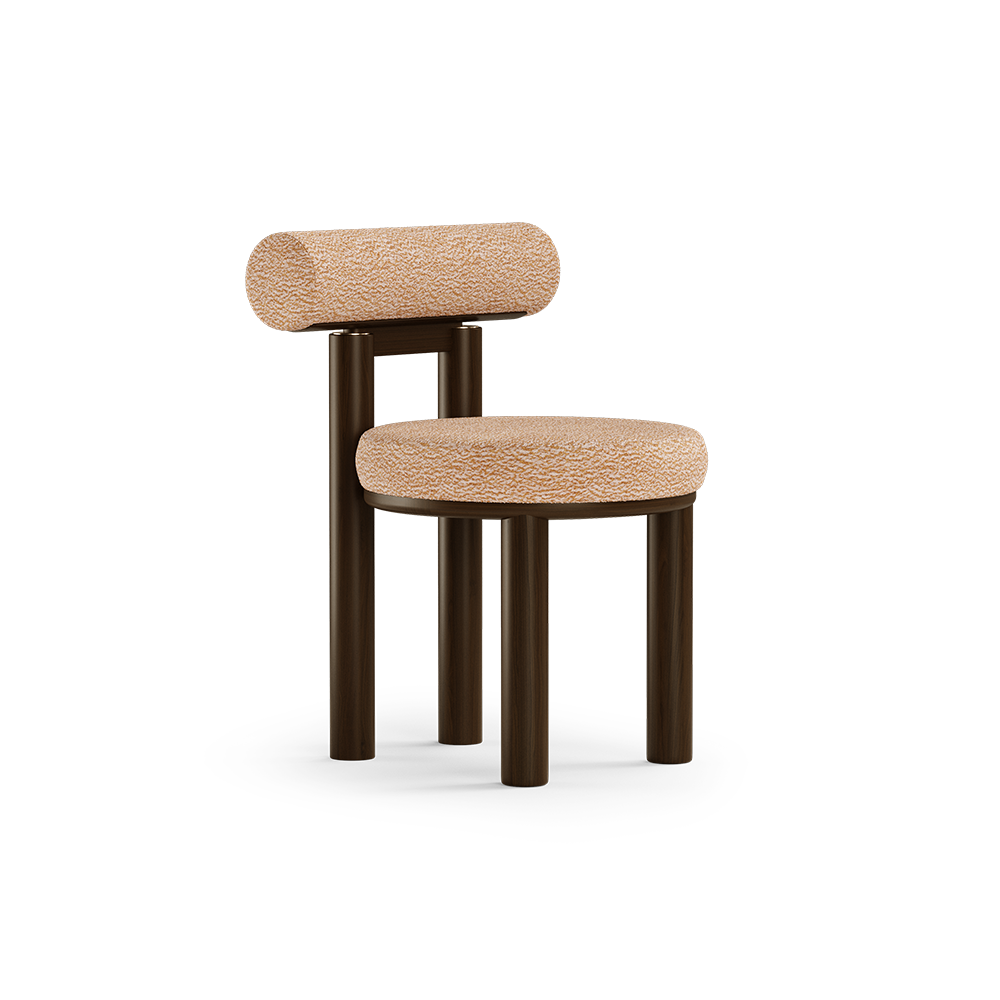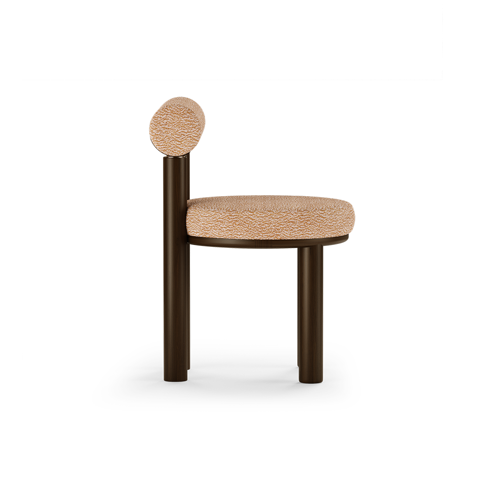 The dining chair represents the influence of curves, patterns and colors in mid-century movement. Made in walnut wood and upholstered with a geometric fabric this unique dining chair has purpose to invoke and provoke. Is the perfect piece to add a modern mid-century twist to your interior living room project.
