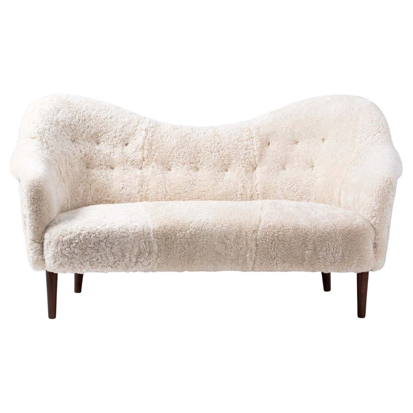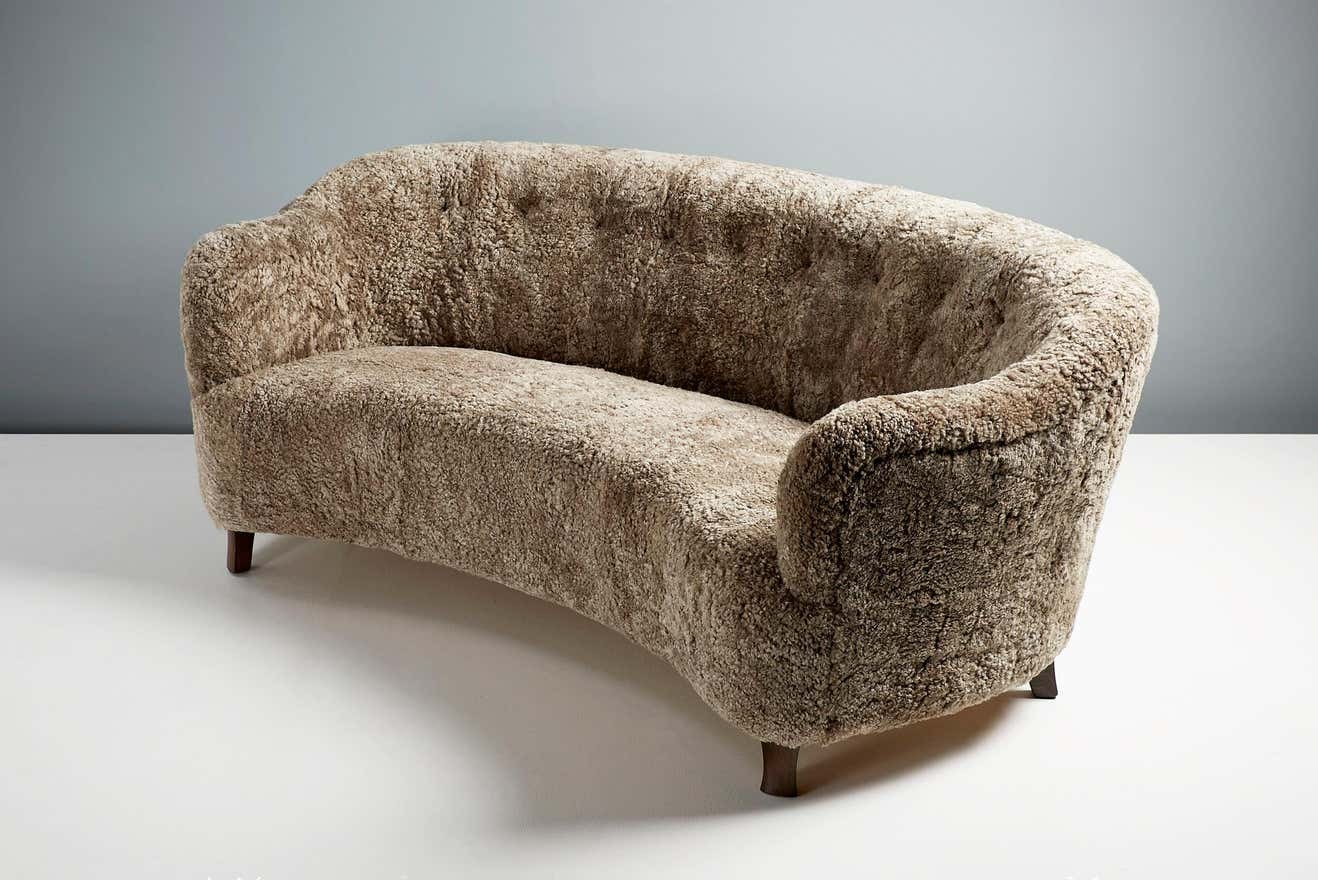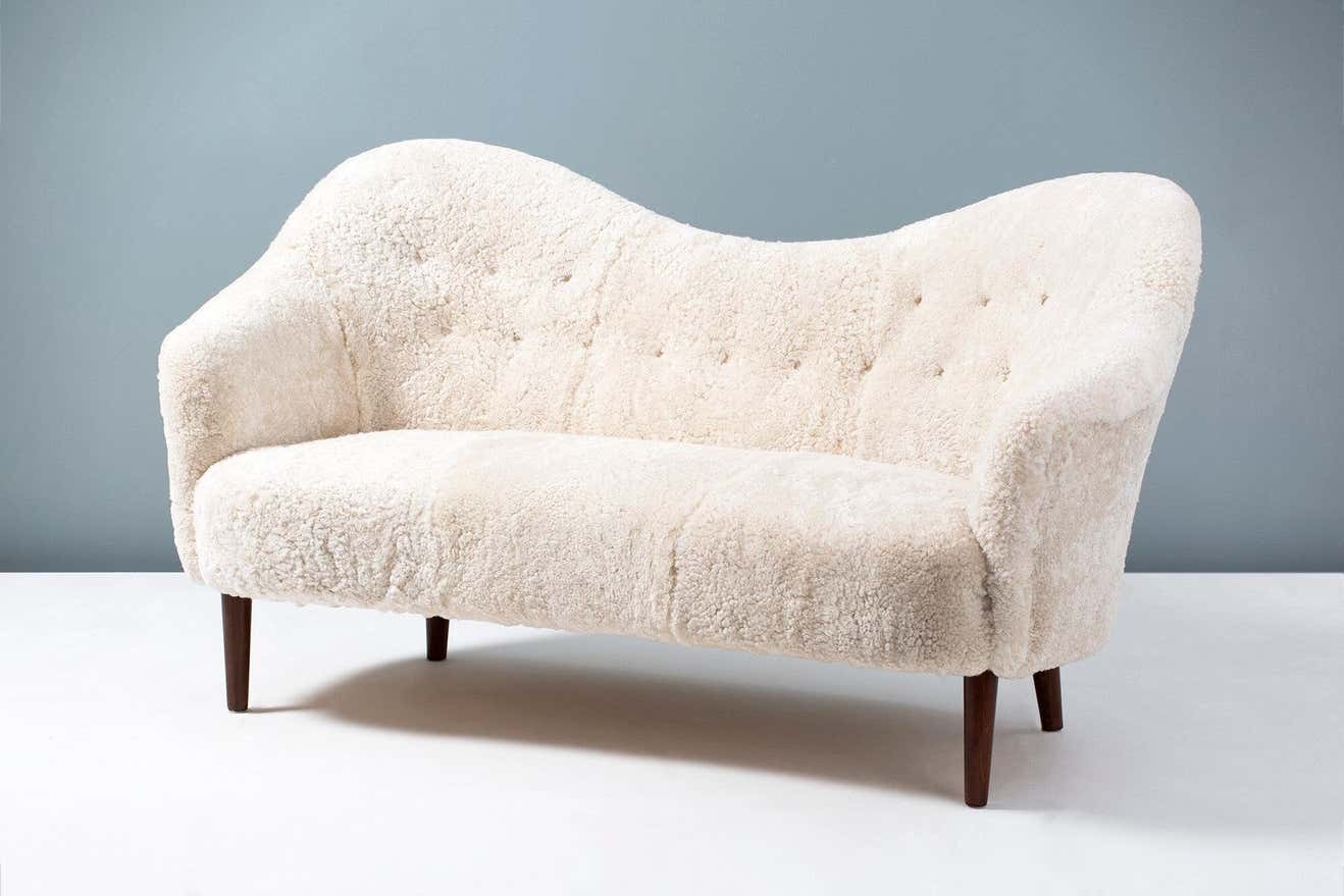 The sofa legs are available in oiled oak, dark fumed oak, oiled walnut (as shown) or dark stained beech. The frame is made entirely of solid English beech and the seat and back are fully sprung to ensure maximum comfort. These sofas are upholstered in luxurious shearling from New Zealand available in your choice 5 different colours. Other upholstery options are also available by request including Mohair velvet and boucle fabric.