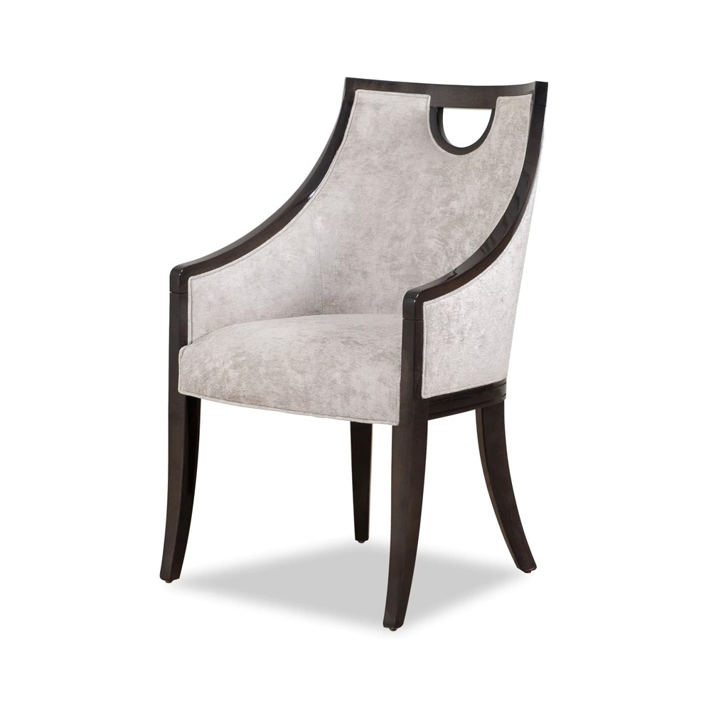 Art Deco tones in a Dark Walnut Moka high gloss finish define these designs. These chairs are upholstered in the finest velvet fabric, allowing for a relaxed and comfortable dining experience. Dining chair, height 93 cm x width 59 cm x depth 60 cm. And Armchair, height 93 cm x width 59 cm x depth 60 cm – with an arm height of 61 cm. Seat heights 50cm. Available in variety of fabrics, leathers and finishes. Prices will vary. Dining Table also available.