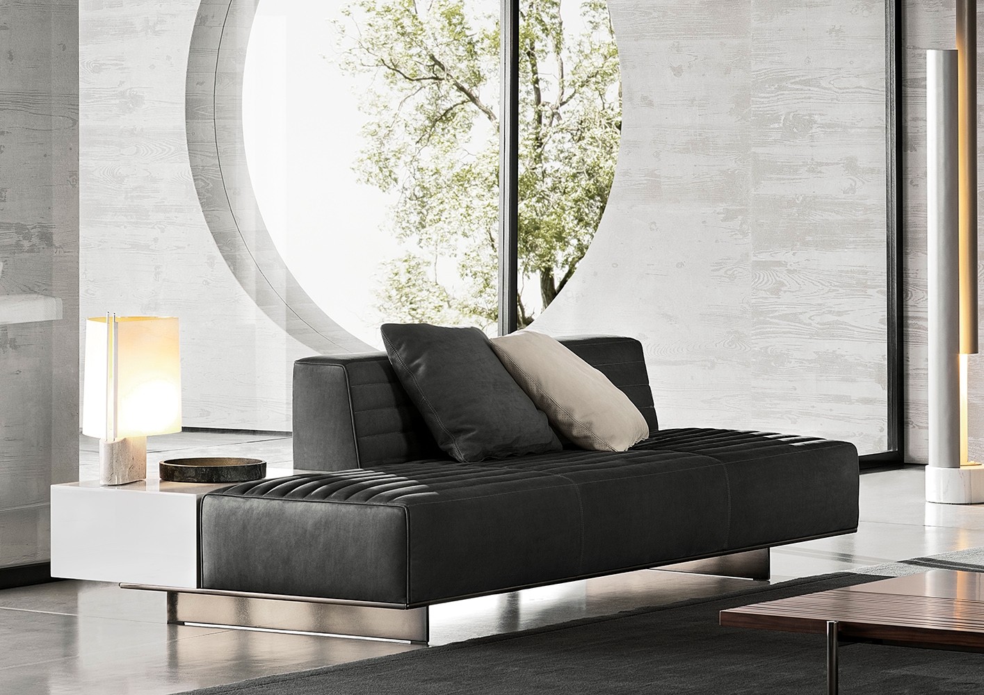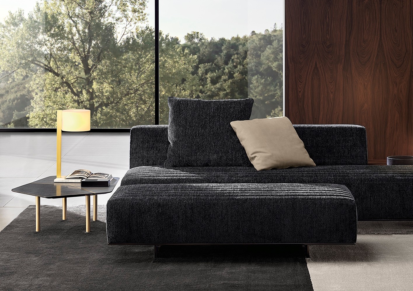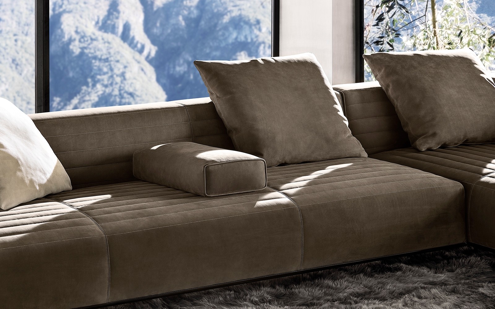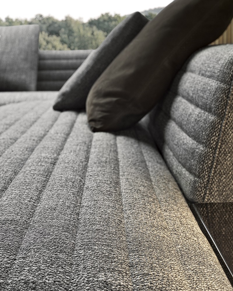 The couture-like skills used in the crafting process are expressed in the graphic quilting effect, sporting long horizontal lines that run along the backrests, the seating elements and the matching benches, endowing the surfaces with a super soft, luxurious feel.