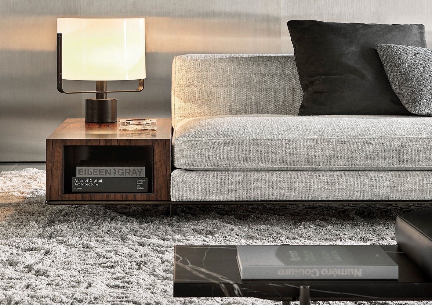 The seating system features pieces equipped with storage coffee tables available in the following finishes: - external structure in MDF with glossy lacquer finish in Ice, Cappuccino and Moka colour, laminated to an internal structure in varnished satin-finish Brandy colour aluminium; - external structure in MDF with palisander veneer, stained Dark Brown, matt polyester lacquer finish, laminated to an internal aluminium structure with varnished Brandy colour satin finish; - external structure in MDF with striped open-pore Black lacquered ash veneer, laminated to an internal aluminium structure with varnished Brandy colour satin finish.
