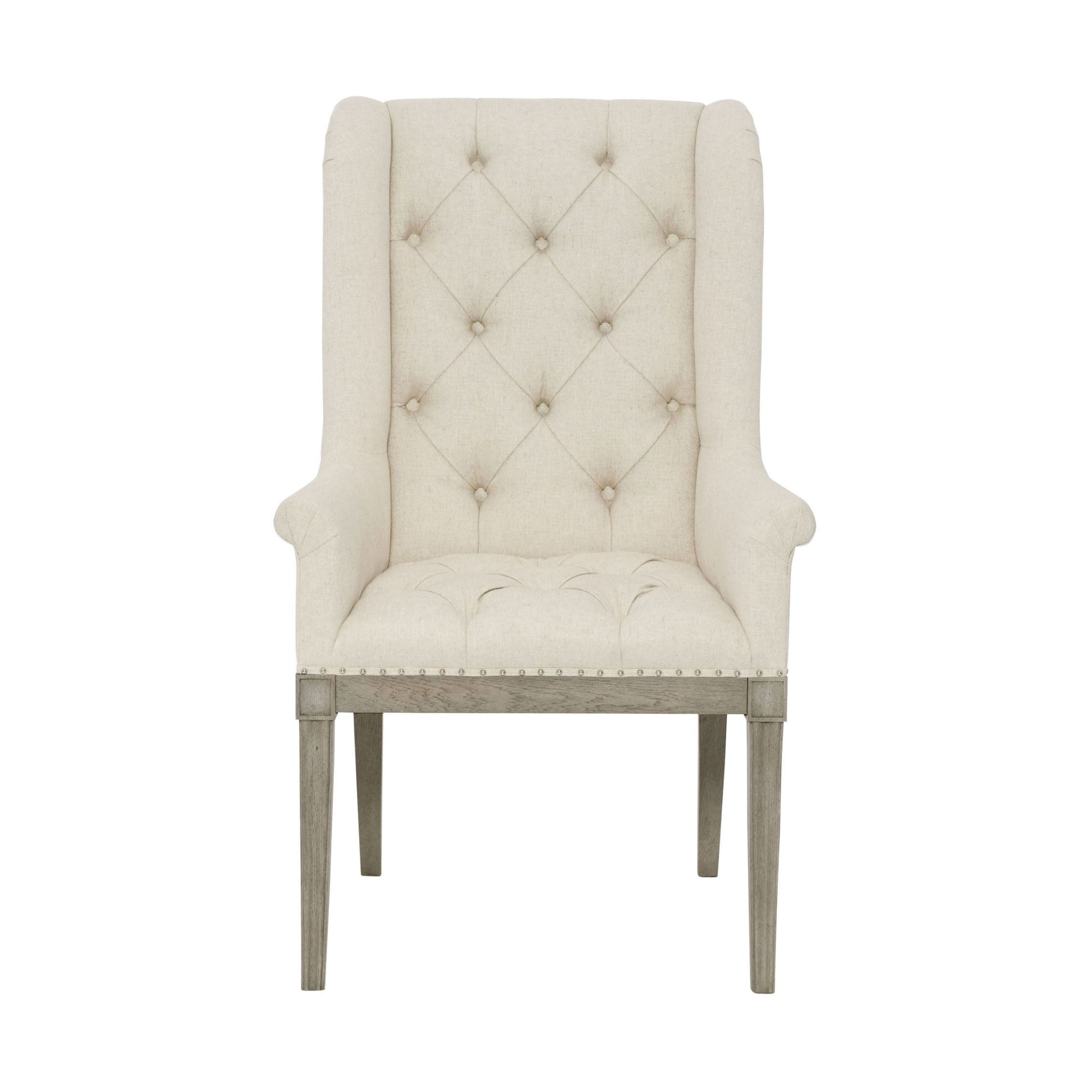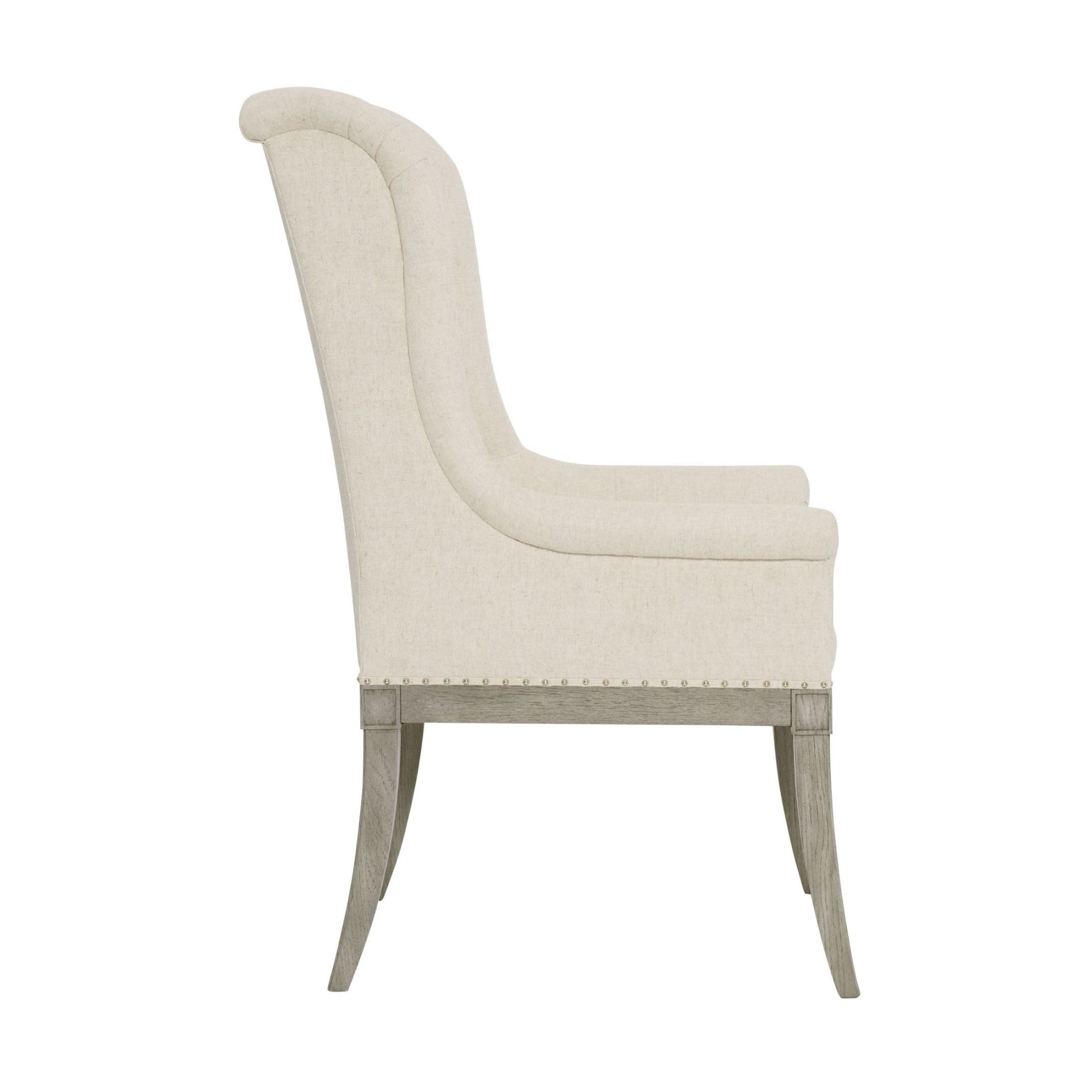 The timeless host dining chair is worthy of its place at the head of the table, seamlessly blending luxury with comfort. With a nod to the traditional wing chair but modern in feel, this charming chair is fully upholstered with a button-tufted back and exposed seat rail and legs. Its timeless quality of style has an enduring appeal.