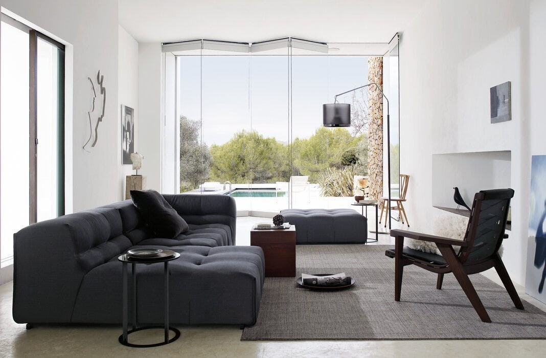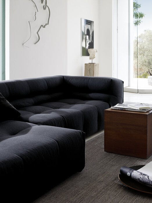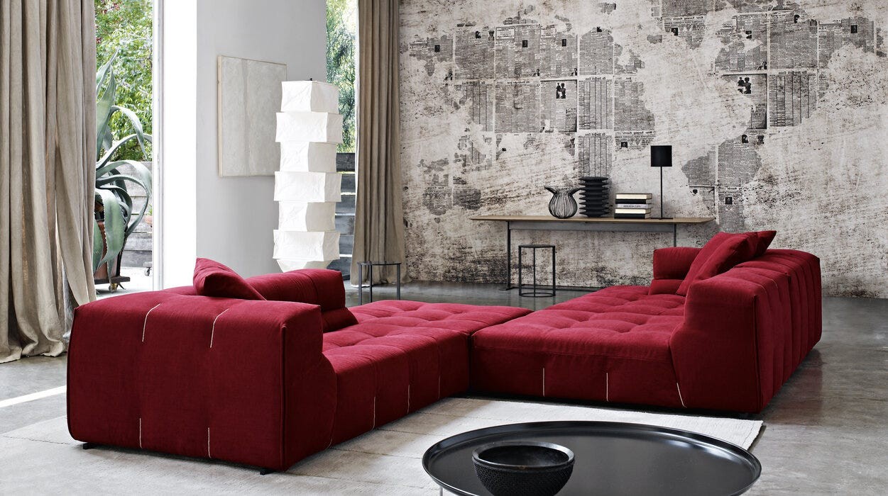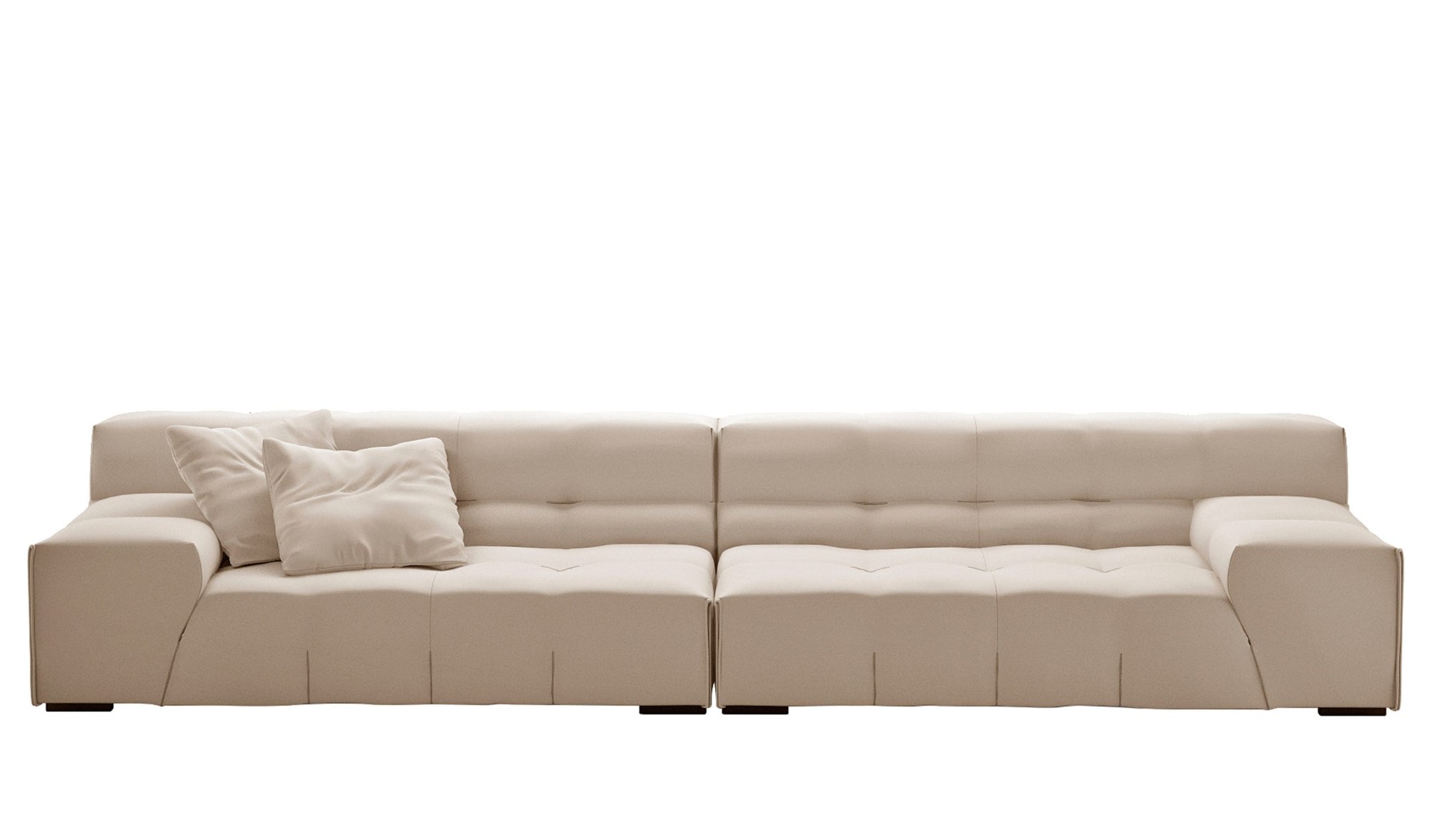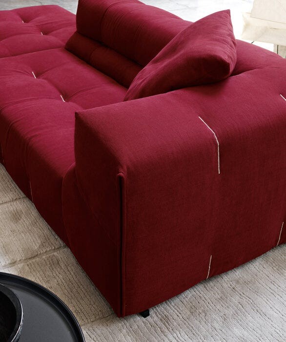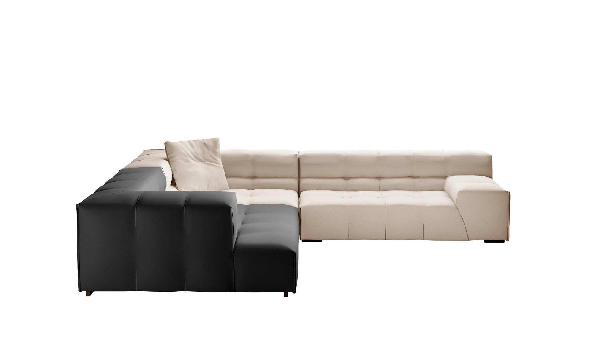 In fabric or leather - stands out for a perceptible feeling of softness along with a decorative quality based on a high-quality tailoring finish. This contemporary proposal makes reference to the '60s and' 70s: the citation of the style lies in the matching or contrasting hues of the cover seams, which become a distinctive feature. The entire line is marked by exceptional modularity and absolute compositional freedom. Numerous elements make up the system, starting with an ottoman as the basic piece, which is then accompanied by central, corner and terminal elements with a low or high armrest. These elements are used to invent traditional sofas, sofas with chaise longue, corner sofas and island elements that provide a 360° seating solution.