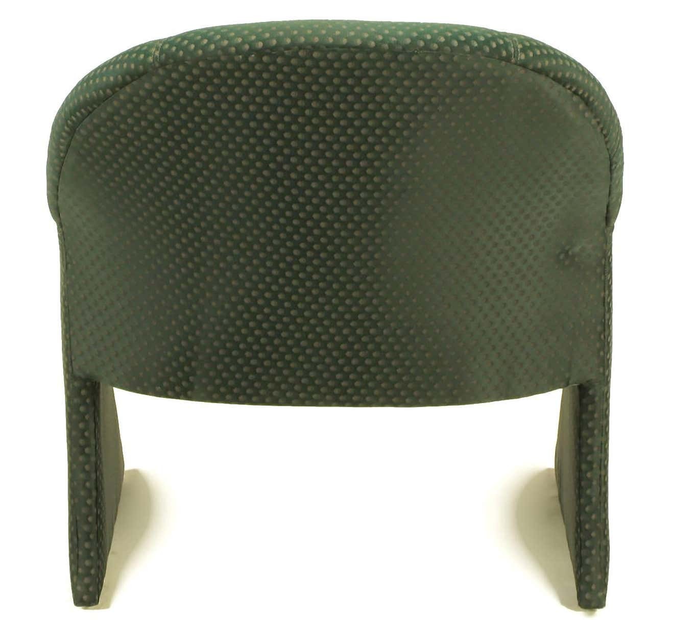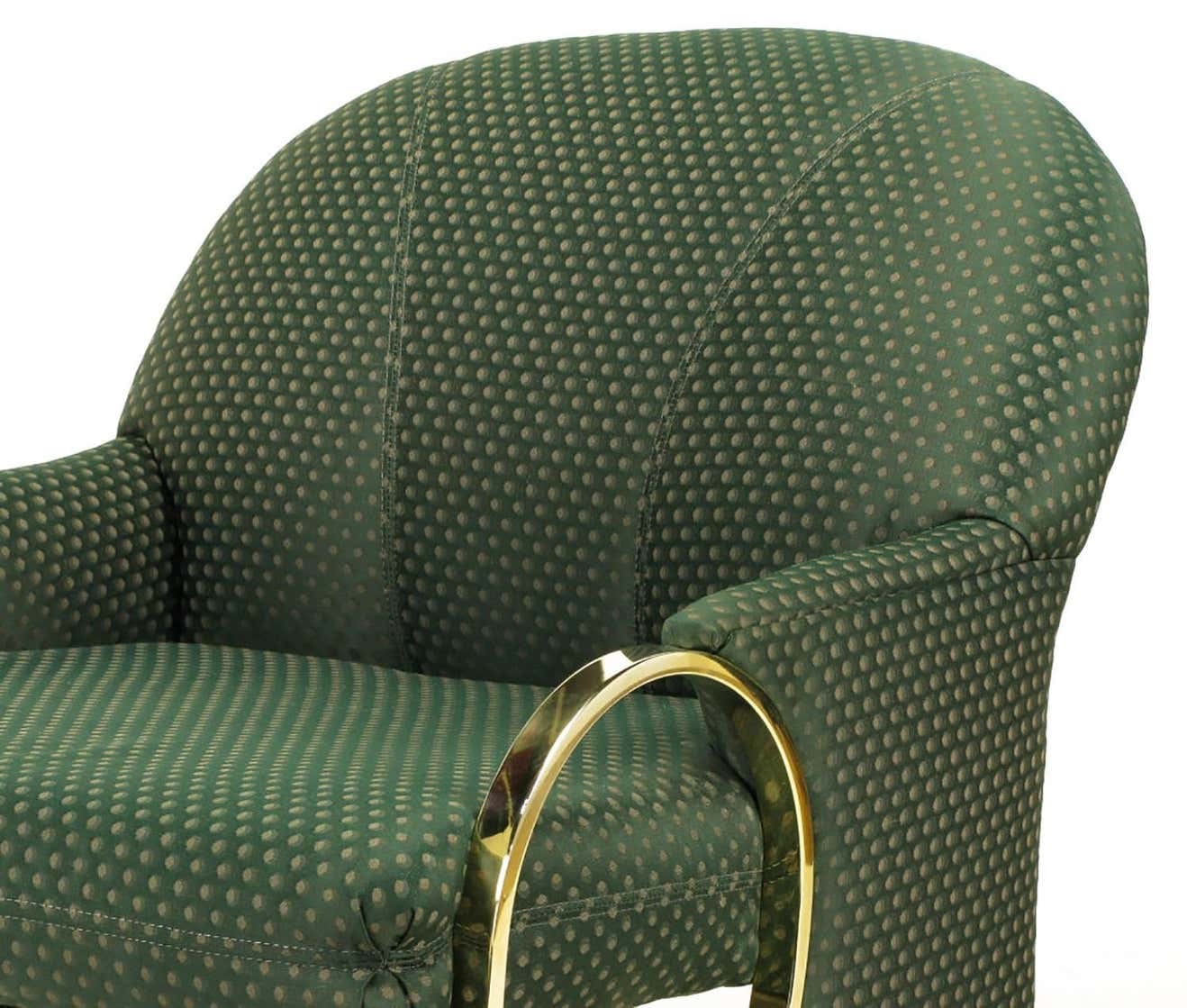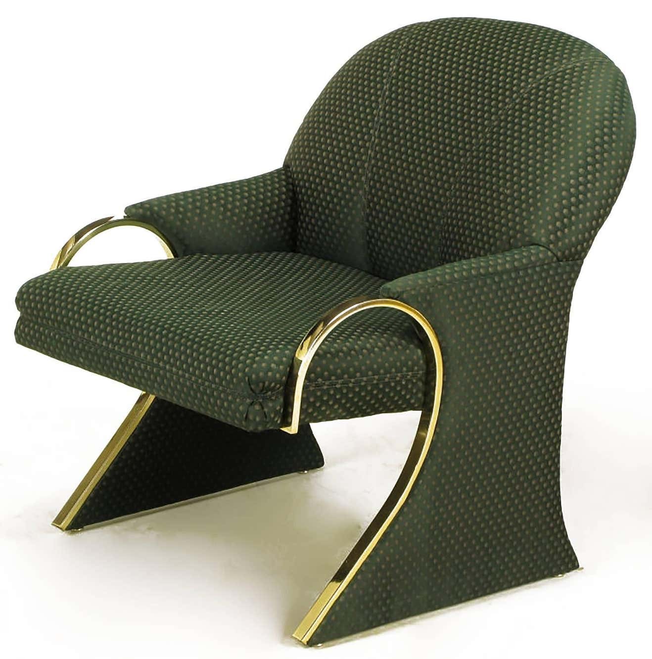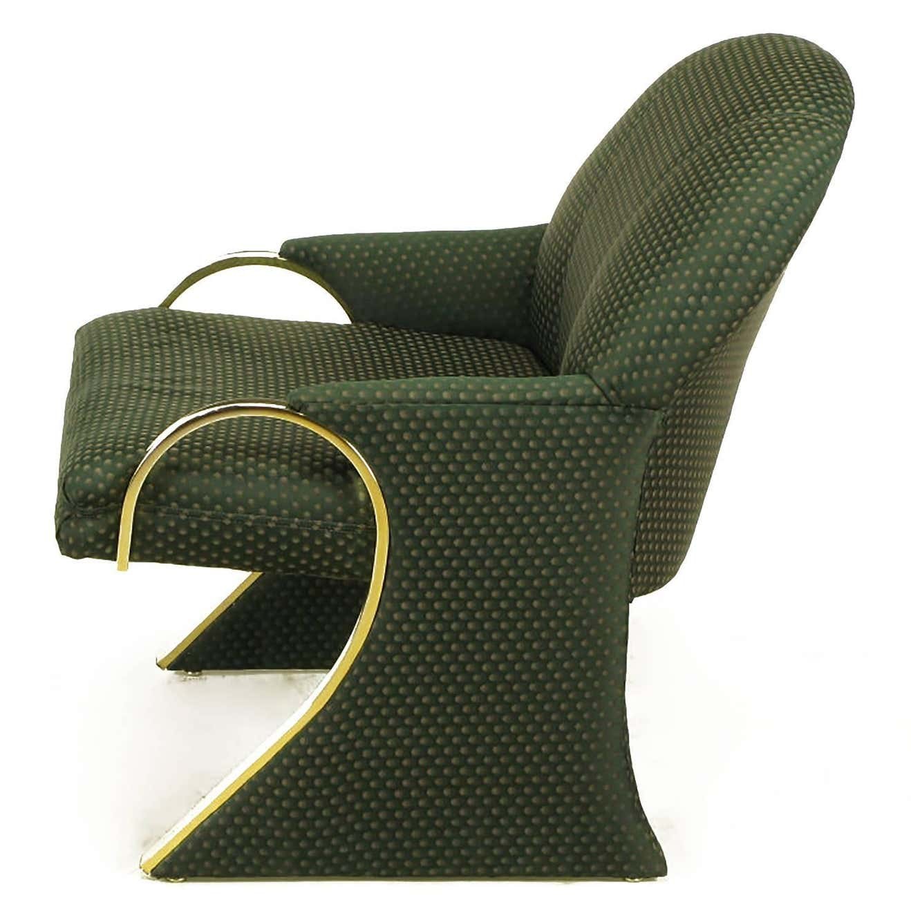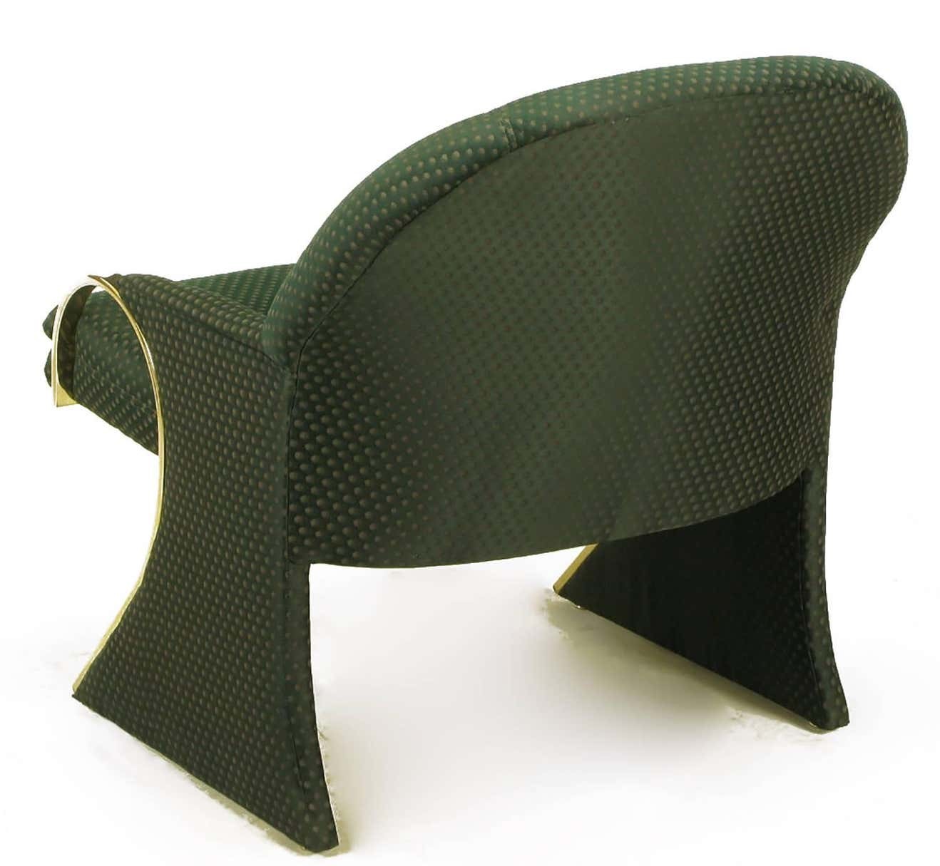 Sculptural sled base Art Deco revival lounge chairs with curved brass detailed arms that continue down the front of the sled base.Upholstered in a dark green pin point silk blend upholstery.