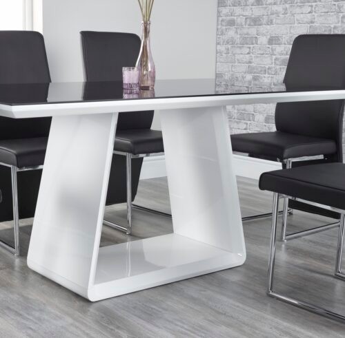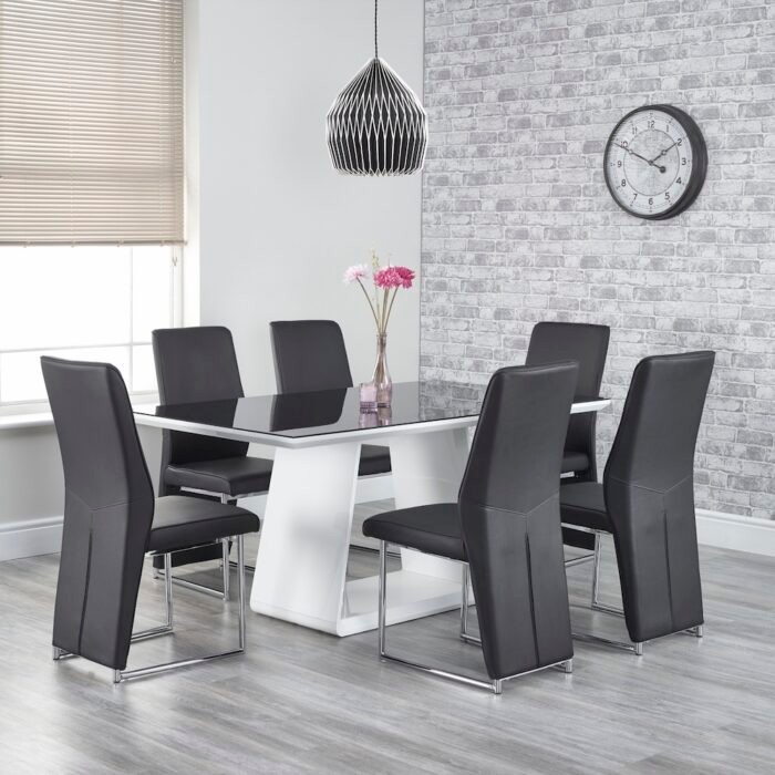 This beautifully contemporary dining set comprises of a high gloss white table finished with an elegant black glass top. 6 Stunning black faux leather and chrome chairs complete this set.