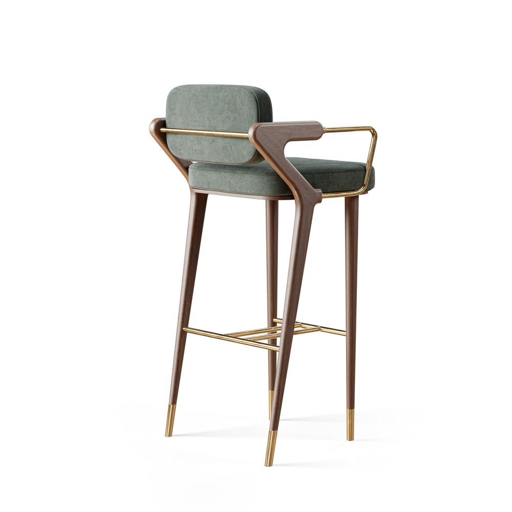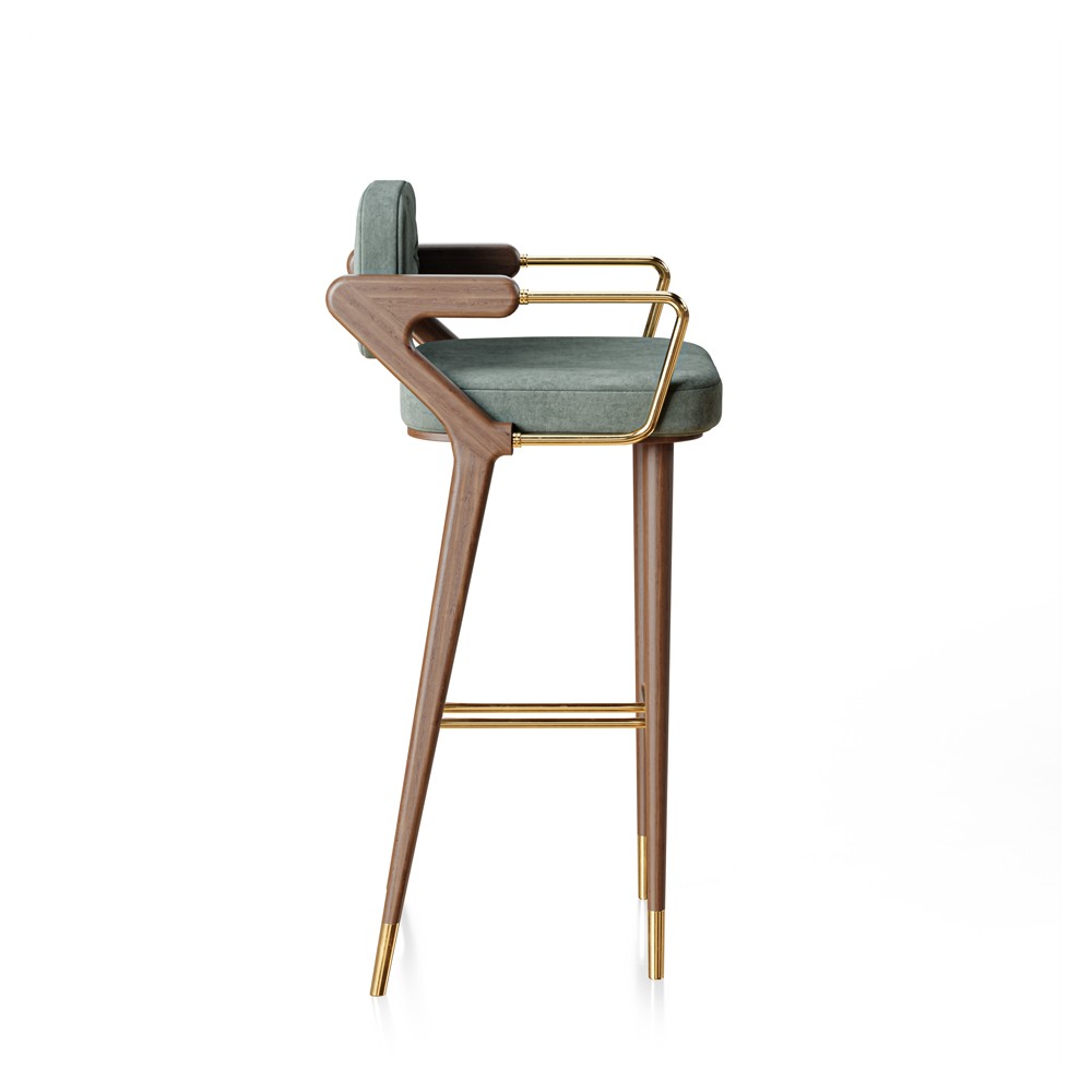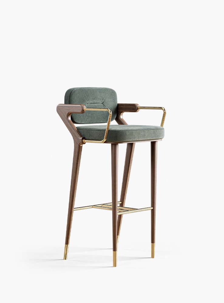 The Zimbro Bar Chair has a mixed design. The upholstered seat and back are meant to evoke art deco and vintage bars, while the rest of the chair exudes a contemporary aesthetic. This chair is the perfect outstanding piece for any bar.