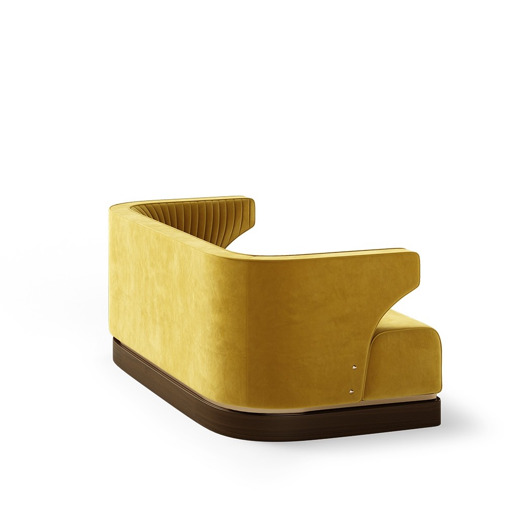 Inspired by the well-known American jazz saxophonist Gene Ammons, the Ammons sofa seeks to convey boldness and luxury through the polished brass details and the soft colorful fabric. It intends to give a fresh aura to any design, and its strong shape is what makes it so unique.