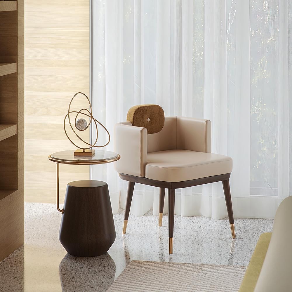 Materials and Finishes: Matte Walnut Wood, Fabric and Polished Brass.