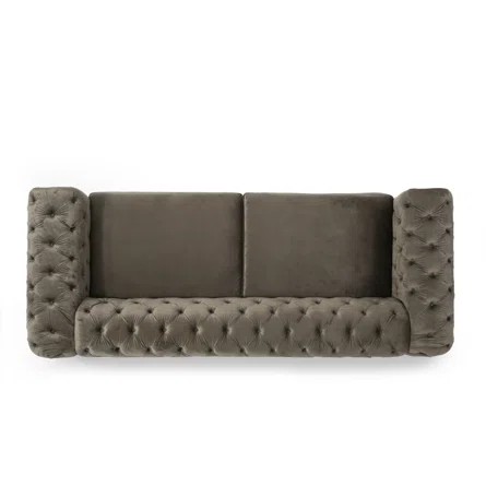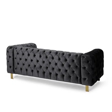 Transform your living room space with a striking centerpiece of absolute sophistication that will bring out the best of your interior decor. Our elegant modern glam three-seater sofa is the ideal addition to any interior space with its smooth velvet upholstery, deep button tufting, and stunning diamond stitching. Featuring a beautiful tuxedo arm design and outstanding gold accents, this impressive sofa acts as a streamlined statement piece that can change the whole flow of your living room with style and comfort.