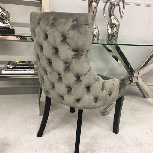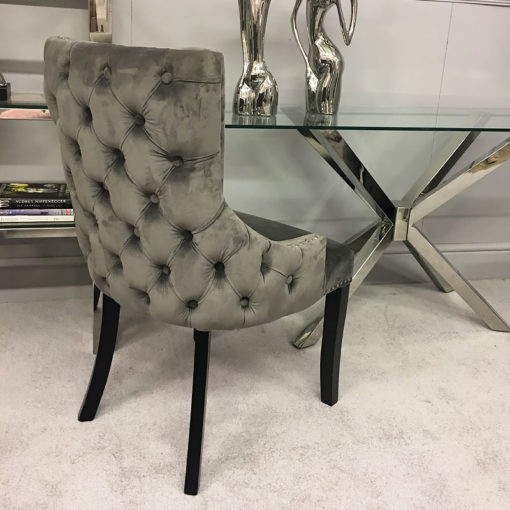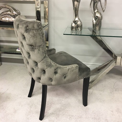 This beautiful and luxurious upholstered dining chair has a soft faux grey velvet fabric and finished with silver studs and buttoned back.