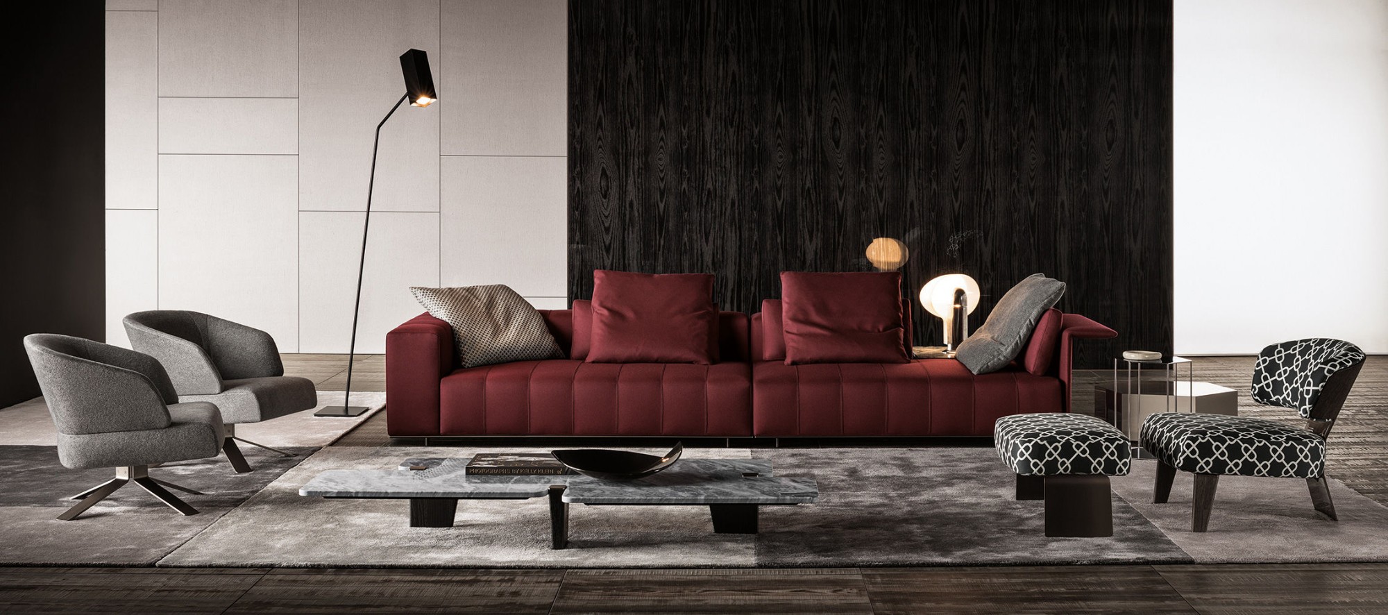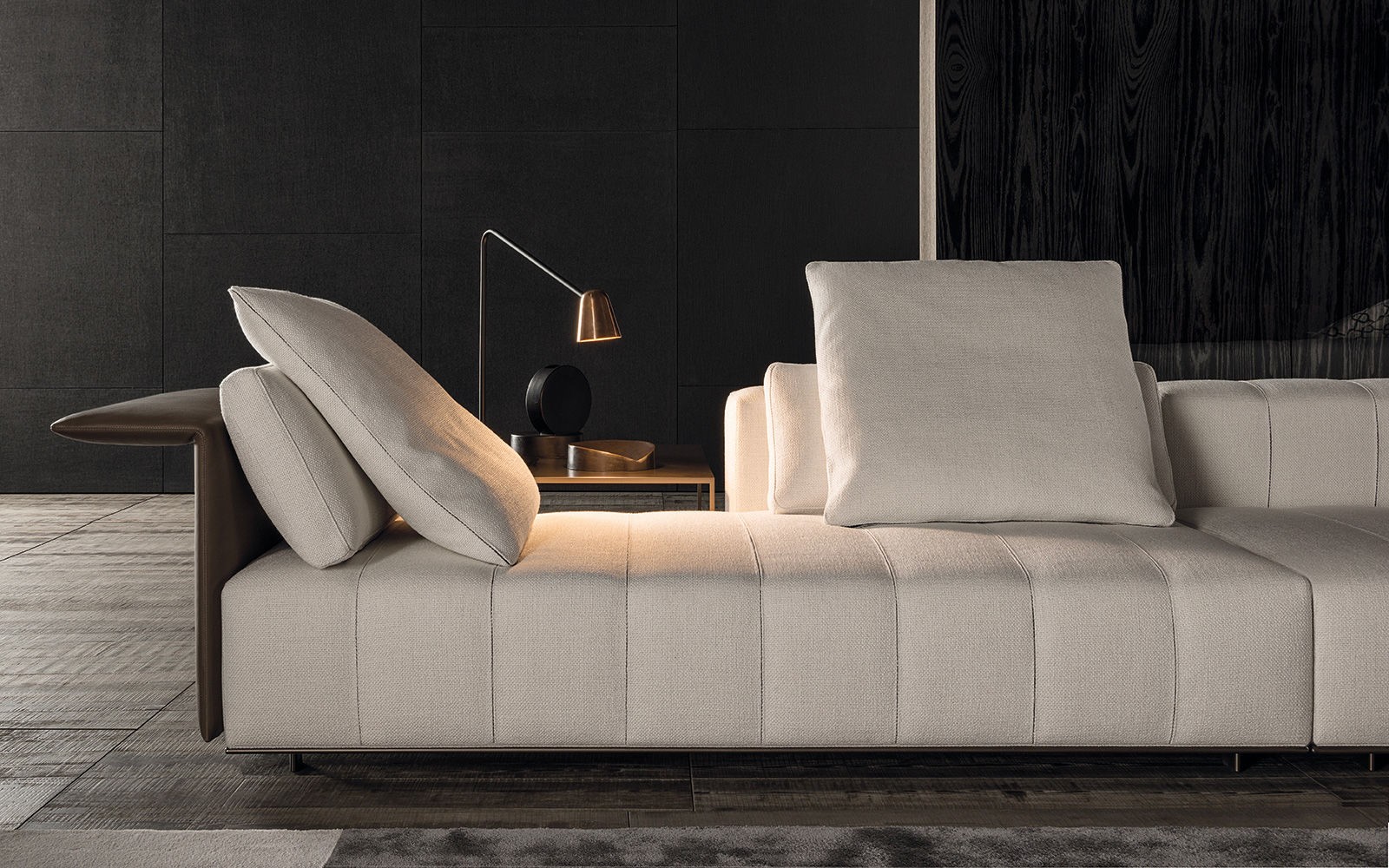 With its highly innovative personality, Interprets the current widespread need to create dynamic, differently accessorized islands of relaxation in which to live more intimately - like for reading and chilling out completely, or more social moments like conversing or spending time with family and friends. This is an orderly clustering of shapes, with one-piece seats decorated with elegant stitching that accentuates its graphic, modern personality. The sophisticated tailoring of the upholstery reveals the company’s expertise in executing extremely complex fine-tailoring techniques. The pieces in fabric are assembled using a strip of eco-leather and double-stitched motif that lend a unique sense of depth.