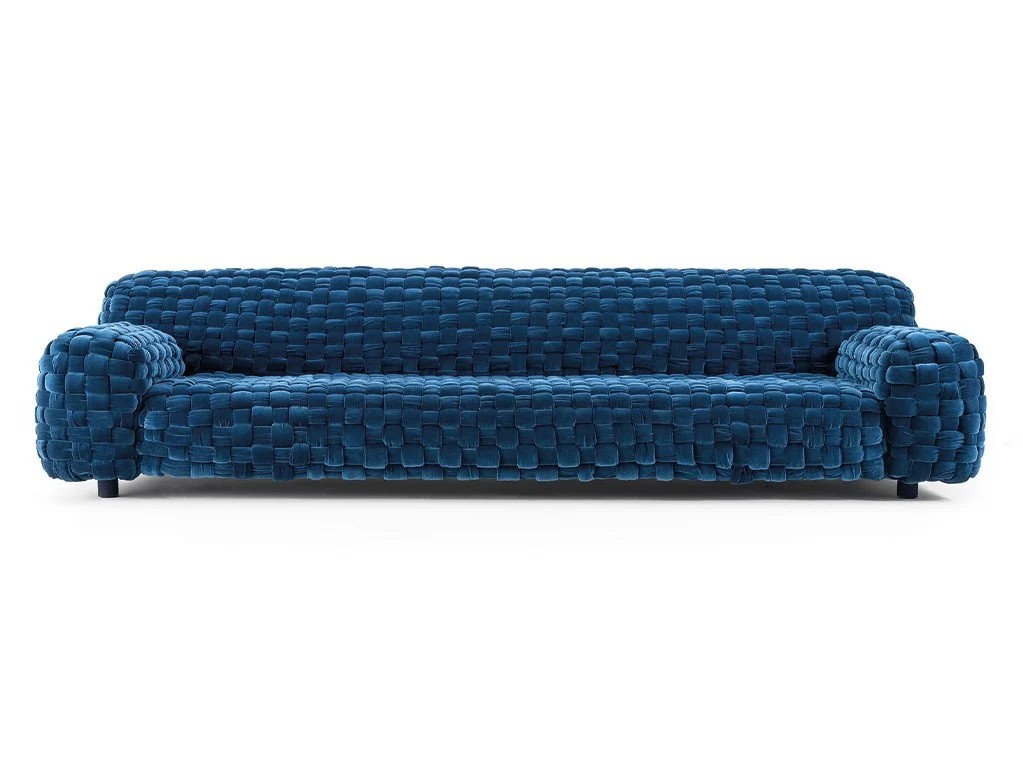 This sofa, while traditional in form, evokes the workings of high fashion with a handmade macro weave in blue velvet. The visual impact is an orthogonal, orderly texture that reveals its softness through the presence of those who use it. The perfection of the Azul sofa lies precisely in its imperfection and in its ability to transform the atmosphere of the space in which it is placed.
