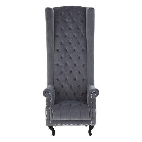 Bringing a regal touch to your home. the elegantly designed tall porter chair from our OEHOME range, will give your room substance, style and total comfort. The solid and sturdy frame is made from robust wood ensuring durability, while being upholstered in luxurious black/grey cotton velvet guarantees a soft to the touch feel. The porter design features a high back rest with refined button detail giving the chair its traditional look. The seat, also featuring button detail. has deep padding ensuring total comfort when seated. The gently curved armrests emphasise the grandeur look which is further accentuated by antiquated silver studs detail that adorns the frame of the chair. Four effortlessly curved legs, with a chrome finish, enhance the regal design while making sure that the chair is stable and sturdy. A wonderful feature in your bedroom or living space, the porter chair will create an eyecatching piece of furniture in your room. Enveloping your body for total comfort, the beautifully styled porter chair from our OEHOME collection complements most decors bringing its own grandiose to the setting.