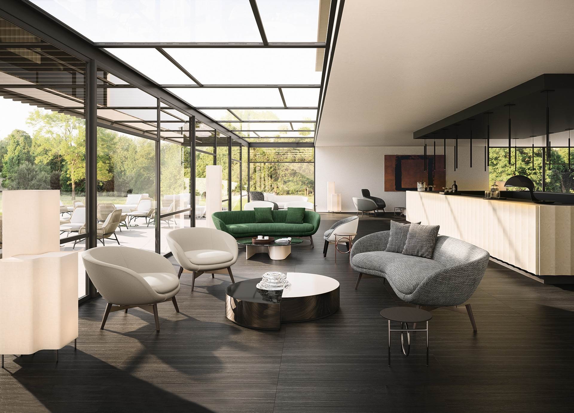The shape takes up vintage lines, modernising them with an incredibly sophisticated silhouette that involves both the seat cushions and the external covering, which comes in fabric or leather, for a combination of textures of great charm.