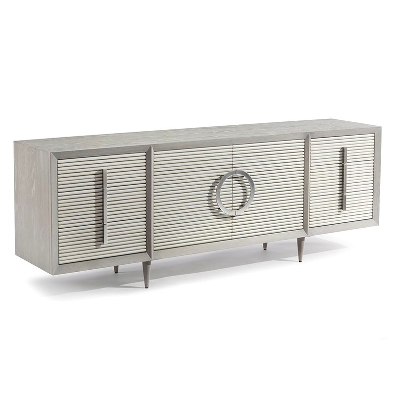The gray oak sideboard has six drawers and 2 center doors with reeded fronts finished in antique beluga.