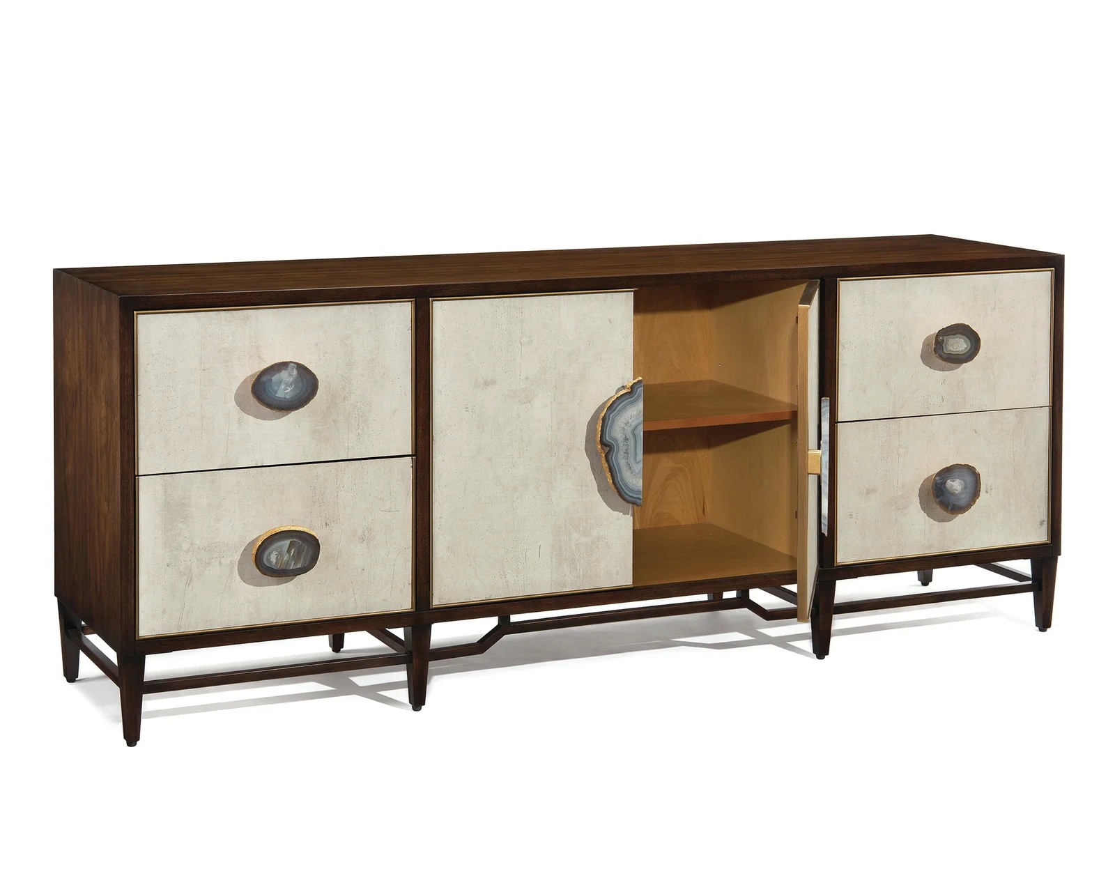 The four drawers and two doors of this credenza are faced in tiza gesso with gold accents, and they are all fitted with agate handles. The case is in American black walnut.