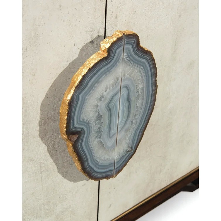 The Mercia Credenza features pull of pure agate. The nature of this stone is very distinctive, and no two will be the same. The pattern and color of the grain will differ on each piece.