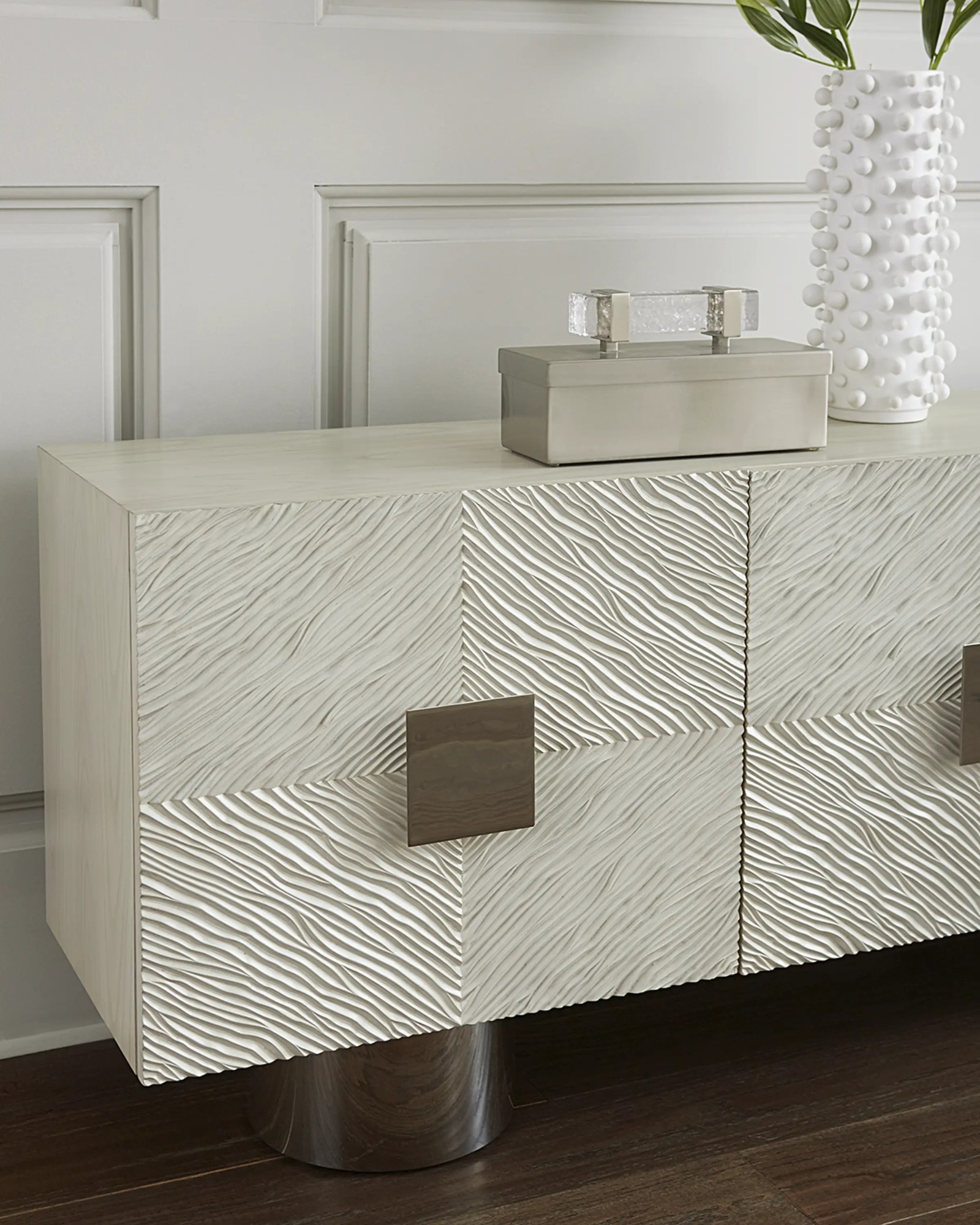 Three soft-closed doors with polished stainless steel hardware and circular pedestal base