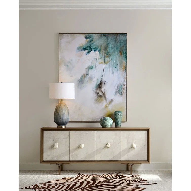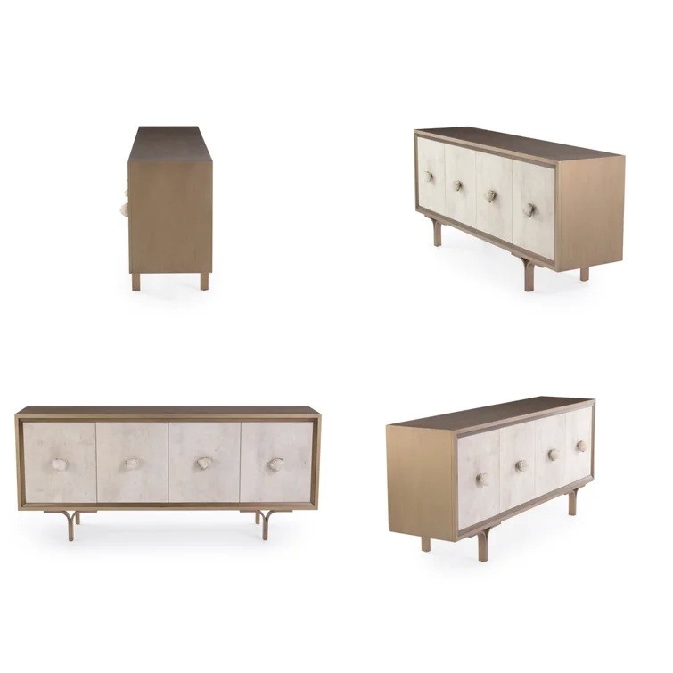 The stepped and gently chamfered frame of this sideboard borders the four doors in tiza gesso. The case is in ash veneer finished in brushed brass, with a dark glaze on the inner step accentuating the door fronts. Oversized crystal handles are centered on each door, which is fitted with soft-closing hinges. The case is mounted on heavy steel, with Y-shaped legs finished to complement the inner step.