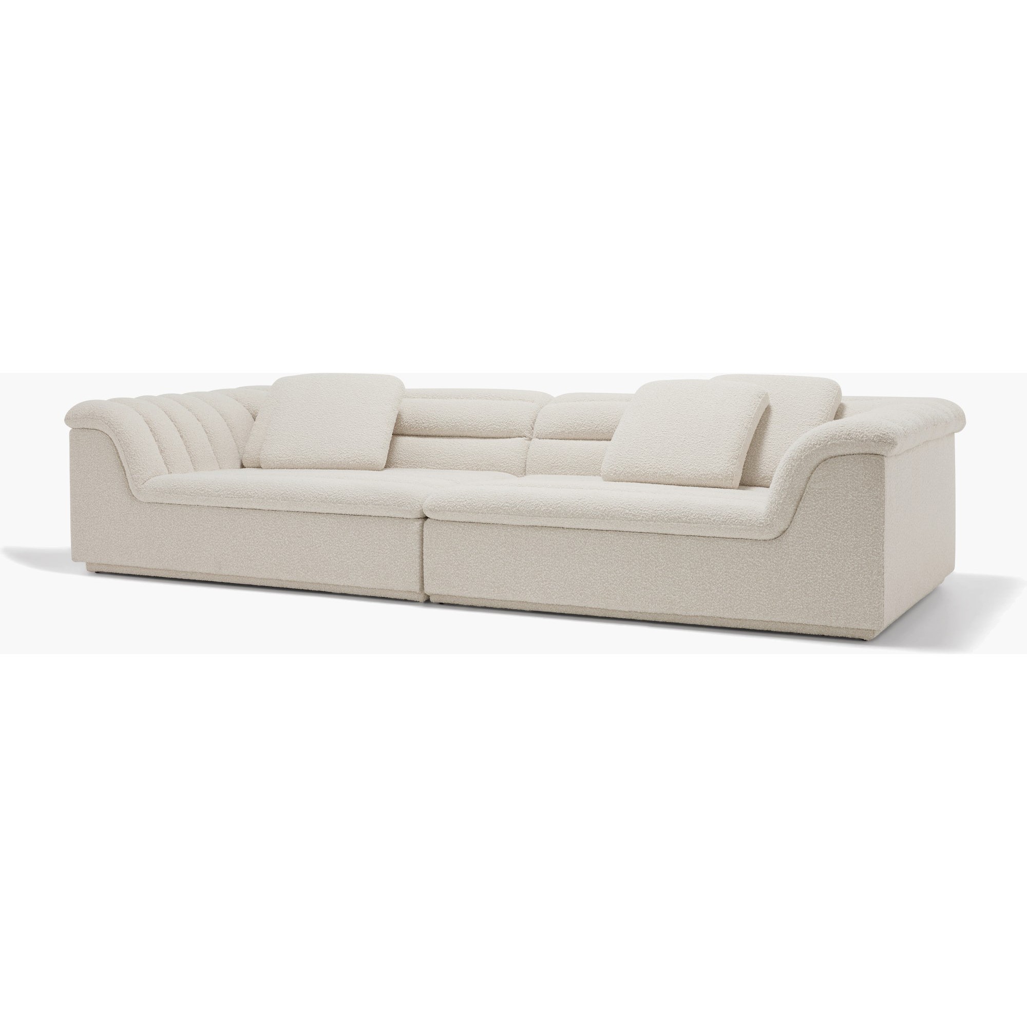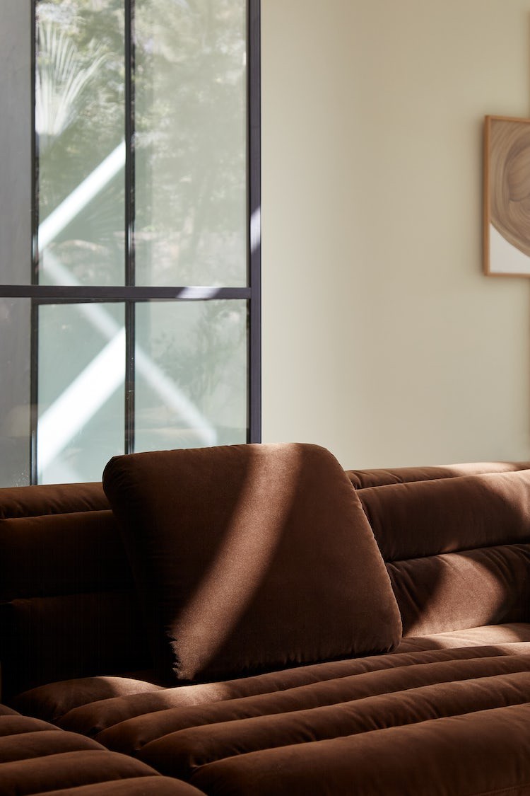 A welcoming, generously sized seating collection with extra-plush channel tufting, deep seats, and wide sloping armrests for comfort from every angle. High-density foam fills the channels for extra cushioning. Float is upholstered in velvet or bouclé fabric, and developed, the rich chocolate brown velvet, specifically for this collection. An ultra-comfortable, laid-back sofa for relaxing and entertaining.