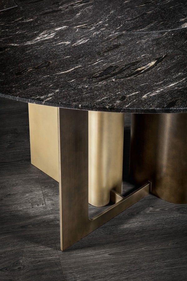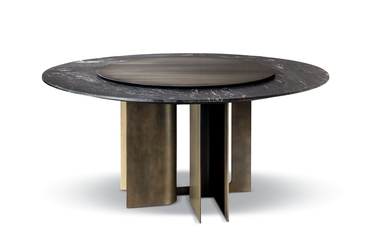Mirage round table in wood, metal and marble. The base is made up of a curved steel plate. The wooden undertop supports the marble top cut into 5 different sections. You can choose fixed or with integrated Lazy Susan (swivel central top). The top can also be made of wood.