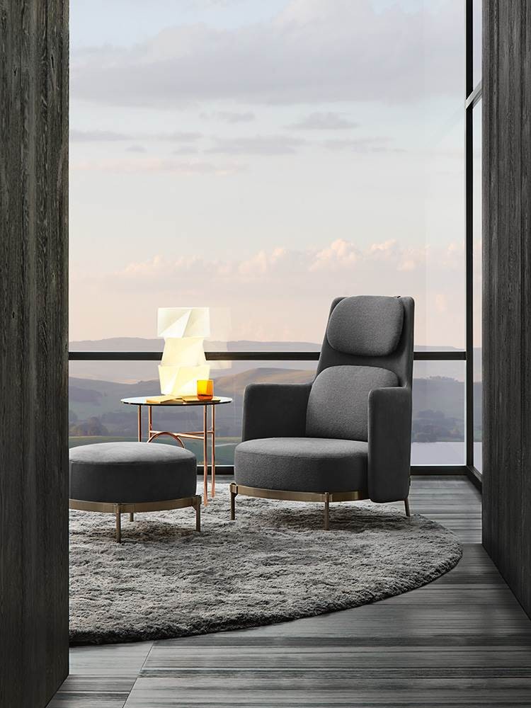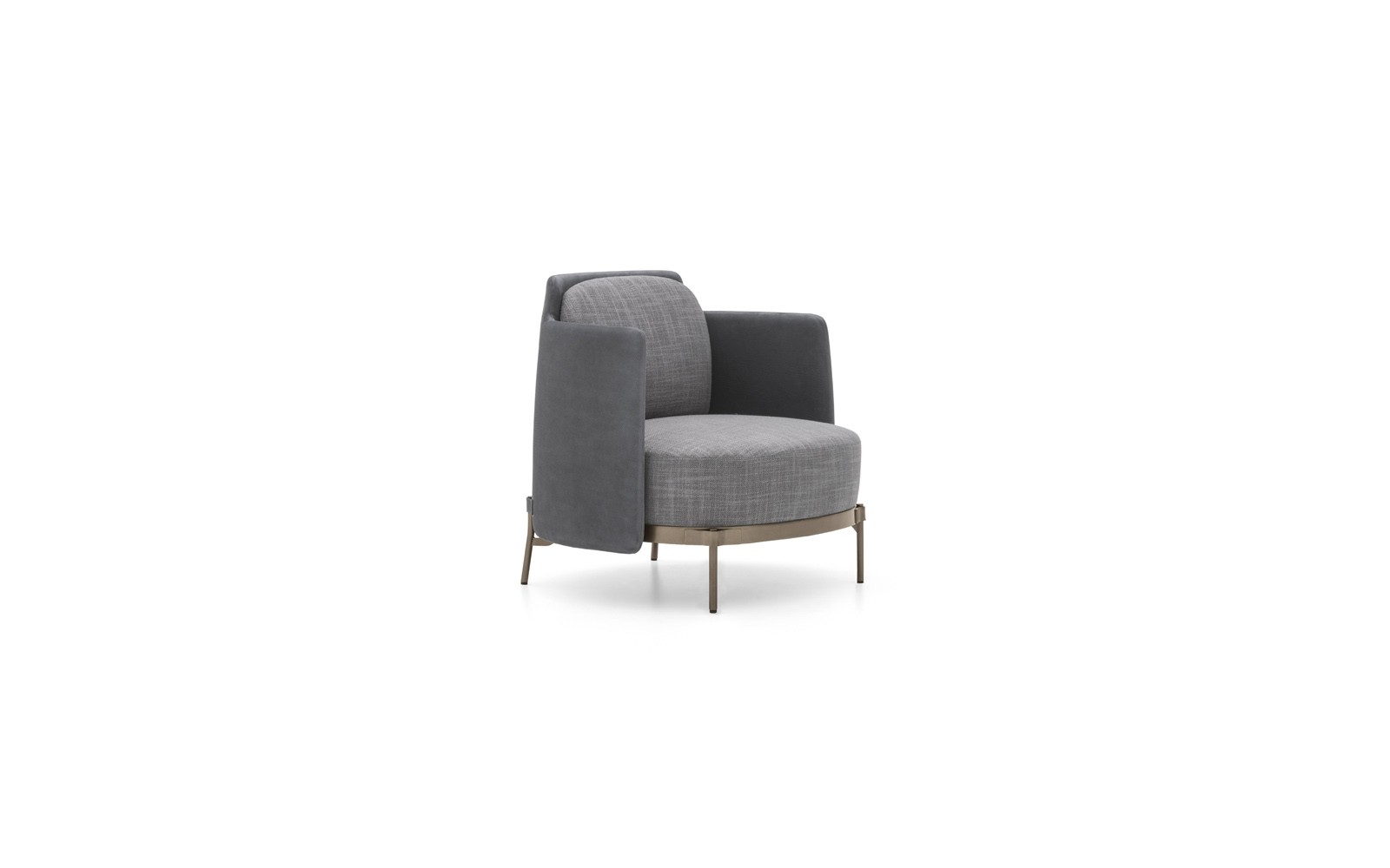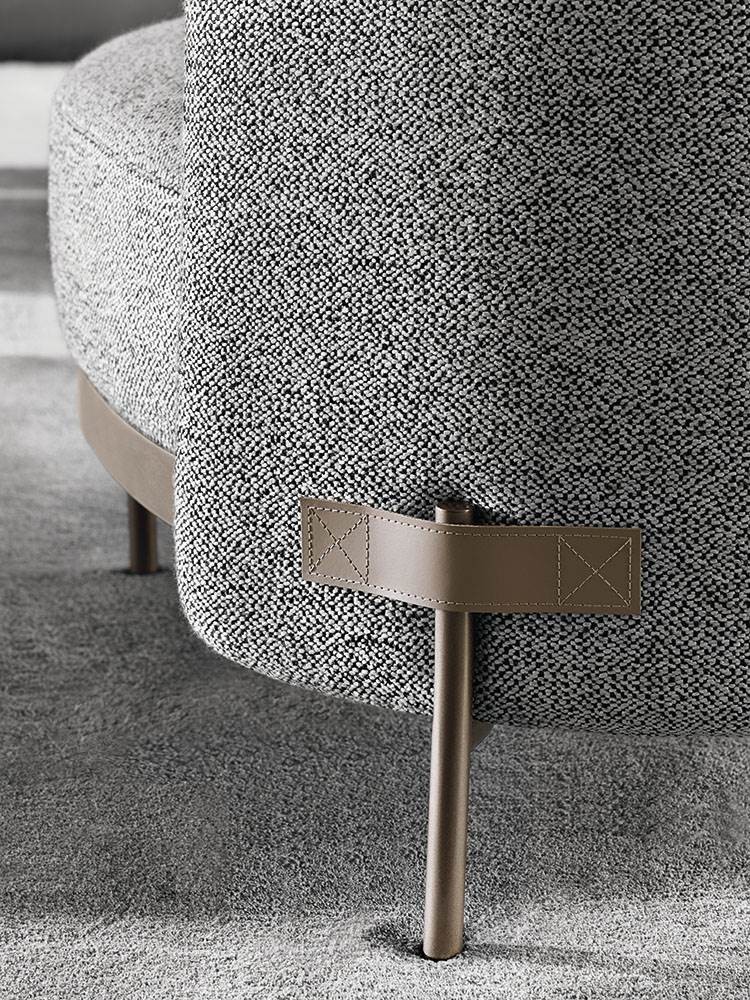 Customizable in a wide range of leather and fabric coverings, it presents two possible sets of pairings. In one version, the fabric covers the back and the seat cushion, while the shell and the tape detail are in leather of the same colour; in the other, the textile envelops the back, the seat cushion and the entire shell, while the tape detail is in Bronze-coloured saddle-hide.