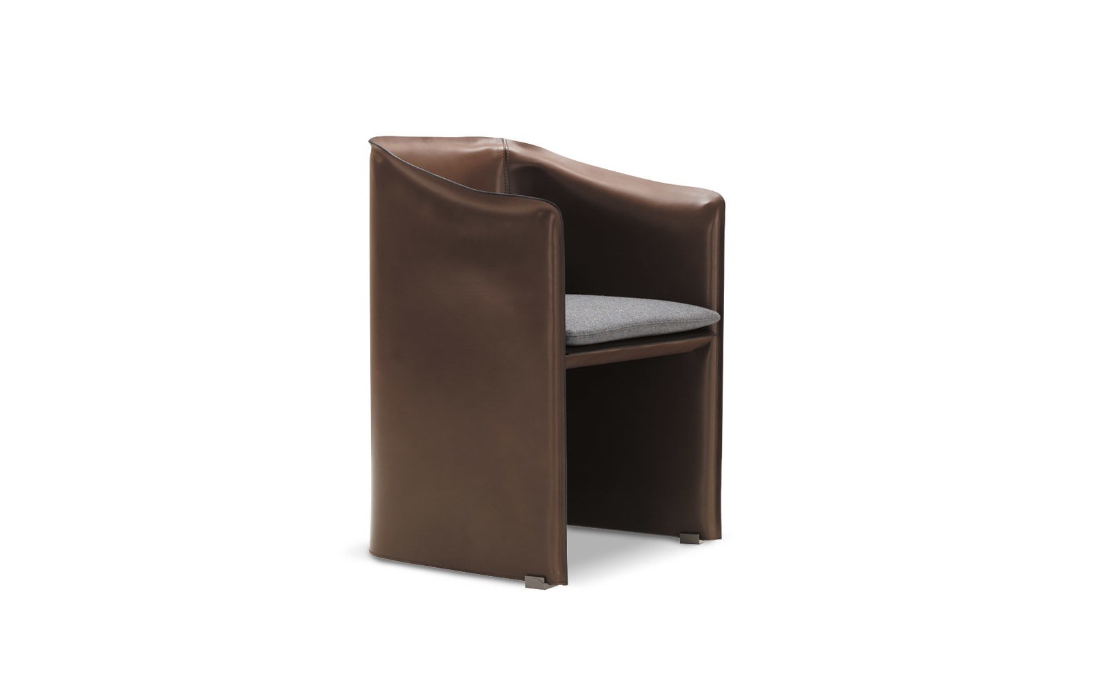 Metal inset let into fireproof polyurethane foam, entirely covered in saddle-hide with special handmade details, available in the following colours: Mud, Black, Tobacco, Dark Brown, Bordeaux, Ash, Dove Grey, Sage and Moka. Seat with elastic straps with a high rubber content.