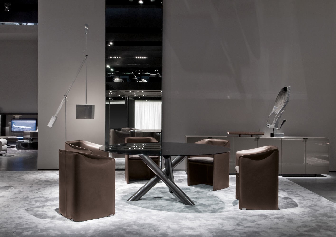 Essential lines and small proportions that expresses its sophisticated elegance through the use of a noble material such as leather, combined with the fabrics of the exclusive textile collection. A seat that finds its natural evolution in the case roller, a piece with pivot wheels coated in soft anti-scratch rubber.