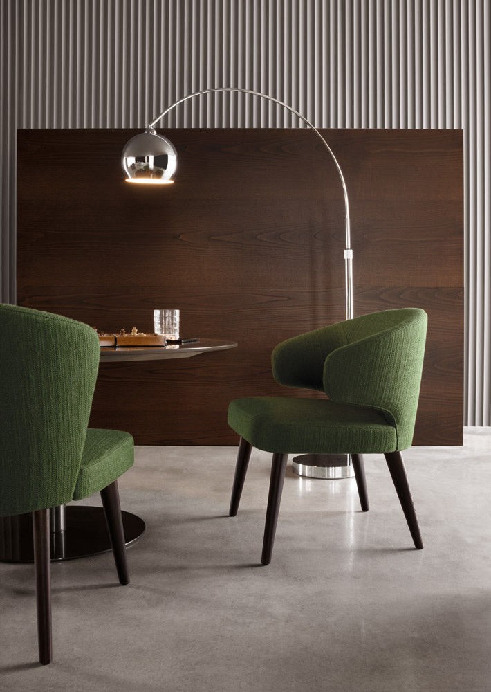 The lounge chair has the same attractive and welcoming shapes that characterise all the seats in the collection. Its enveloping backrest and its soft seat with padding support on solid wood legs of ash dyed tobacco with open pore or lacquered moka with open pore.