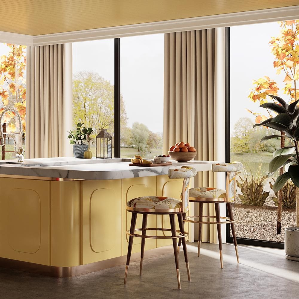 Materials and Finishes: Matte Walnut Wood, Fabric and Polished Brass