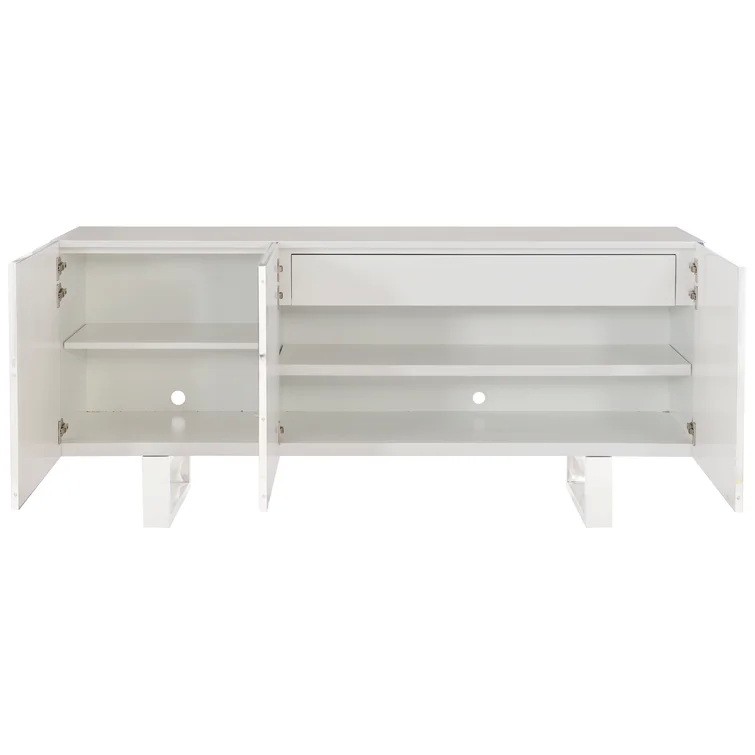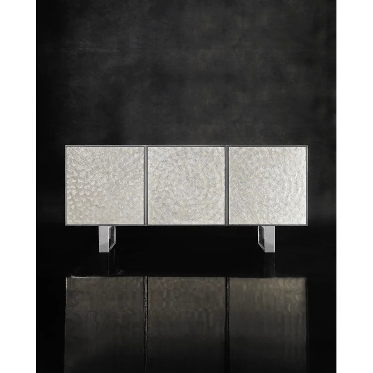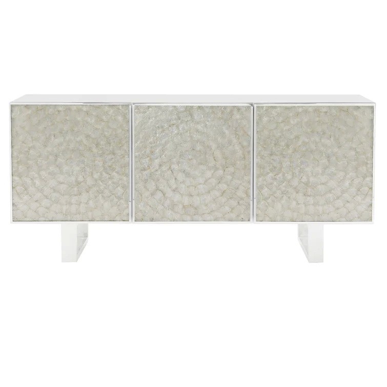 Three soft-closing doors with a polished stainless steel frame with a capiz shell panel in a starburst pattern. Behind the left end, the door is one adjustable/removable shelf and one grommet hole with a cover for wire management. Behind paired center and right doors is one adjustable/removable shelf, one drawer, and one grommet hole with a cover in the back panel for wire management. White painted interior. Two polished stainless steel open-style legs. Adjustable glides. Anti-tip kit.
