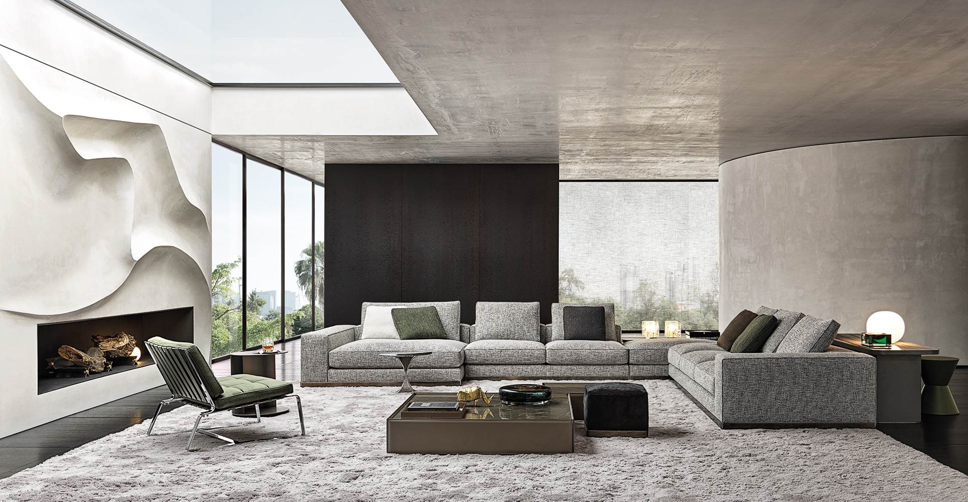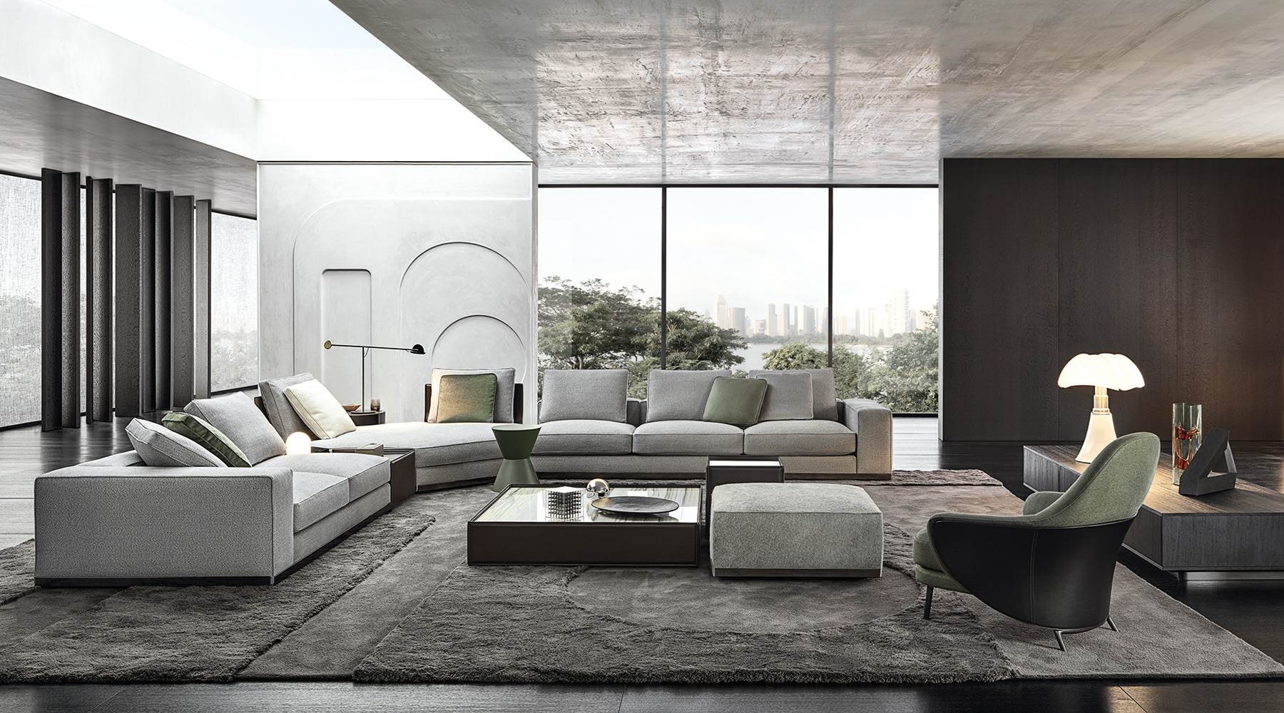 Sofa leaves plenty of room for interesting compositional possibilities: it enters a harmonious dialogue in terms of both colour and shape with the Amber coffee tables, is complemented by the Side coffee tables, with their frame in saddle hide that evokes that of the backrest and enhanced by the Clive consoles, which play around with surfaces, even setting one over another.
