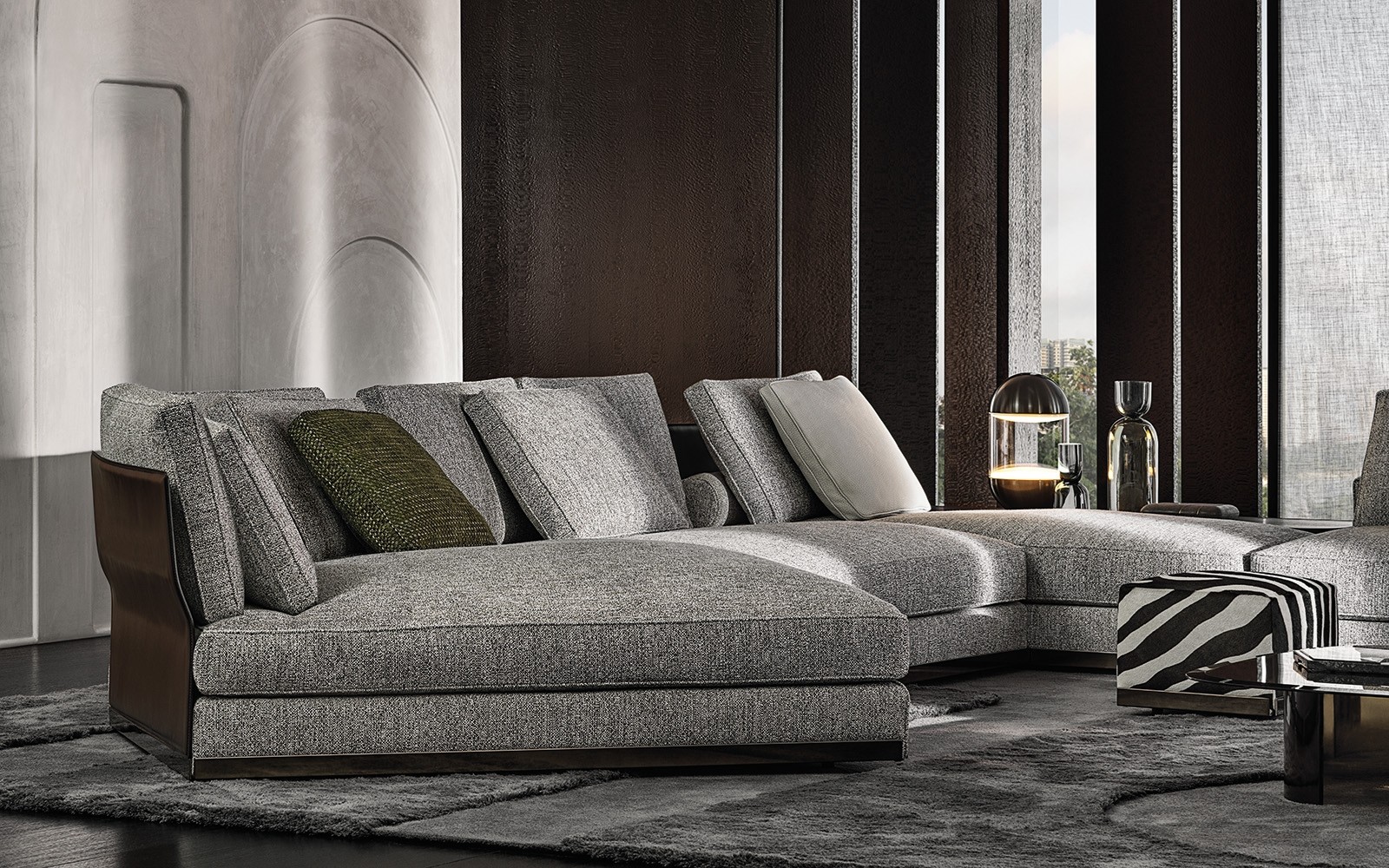Every element of the system is made with exquisite goose down padding to ensure maximum comfort, features cushions finished with a piping that defines their profile and a distinctive aluminium strip, slightly rounded at the edges which skims the floor, in a brand new polished Brandy colour finish.
