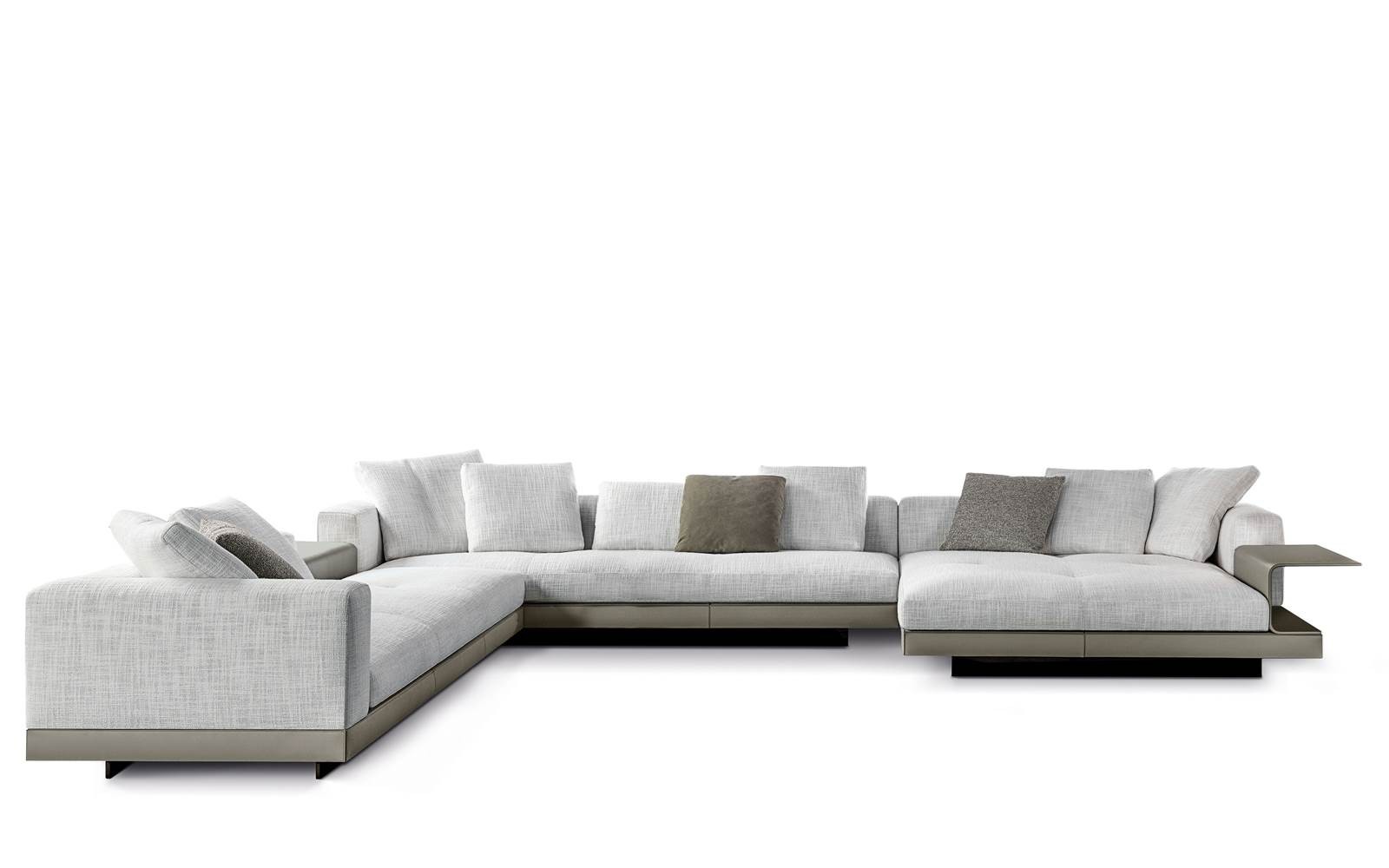 The structural base is raised from the ground on thin blades in extruded aluminium in a Brandy polished varnished finish, positioned at the front, giving the sofa an appealing and airy look, and recalling the metal parts of trunks and suitcases.
