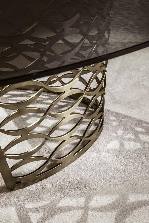 Modern table made of glass or marble with oval top and worked metal base. Top available in marble or glass; the laser-cut steel plate base is milled and bent to form a three-dimentional pattern; golden and bronzed finish or leaf-work decoration create a strong visual impact.